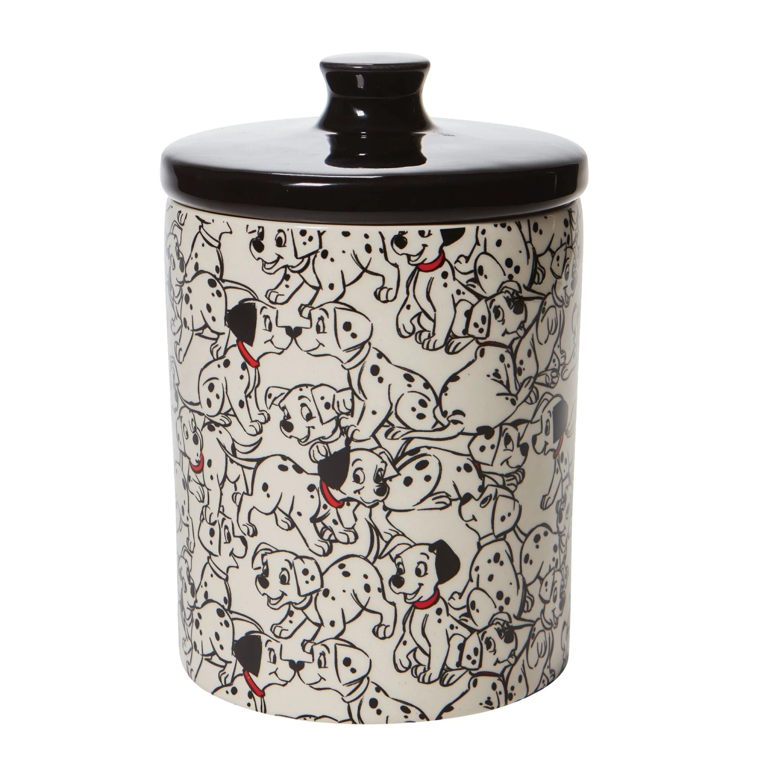 Celebrate the 60th Anniversary of Disney’s 101 Dalmatians with this food safe and sturdy stoneware ceramic canister perfect for pet and human treats alike. Decorated with little dalmatian puppies all around the canister.
