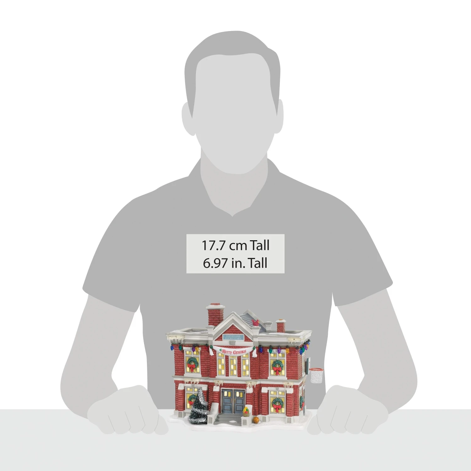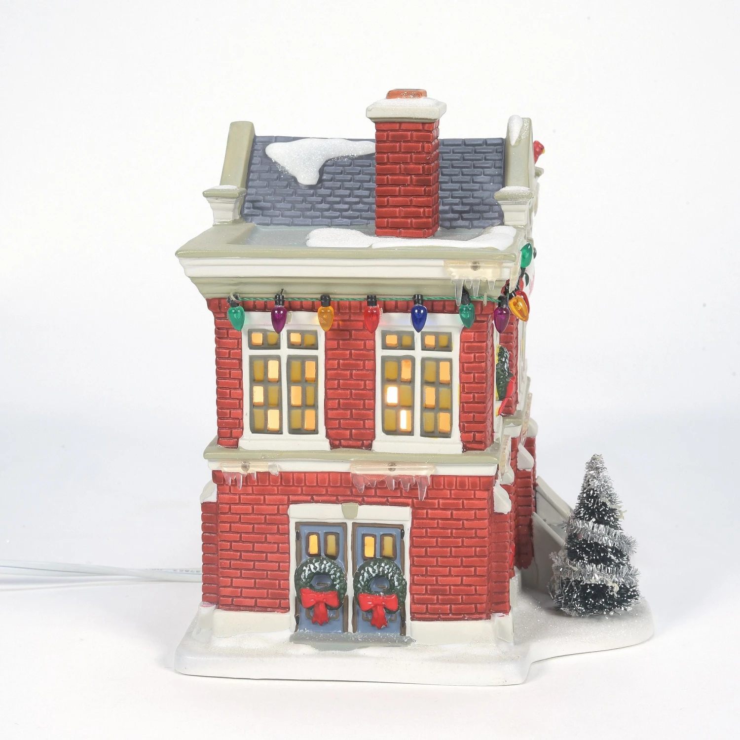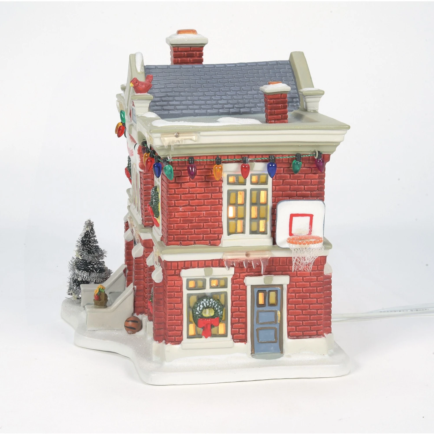 Inspired by the Cleveland Elementary School in the Warner Bros. movie “A Christmas Story”. Hand painted porcelain, with light cord.