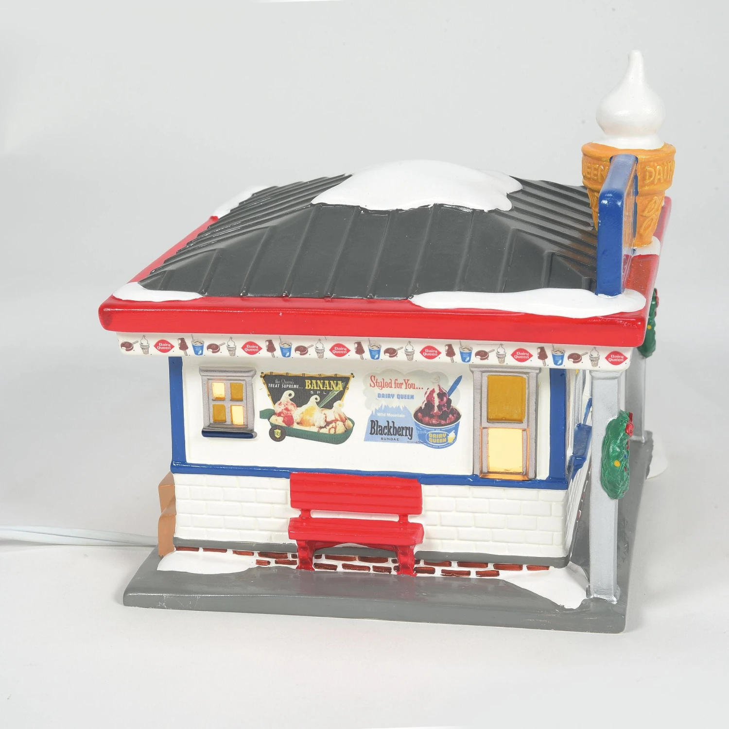 Our old fashioned Dairy Queen is a welcome treat to the folks in Snow Village. Designed with lots of vintage flare, decals represent the menu boards and signage that decorate a four sides of this charming ice cream parlor.