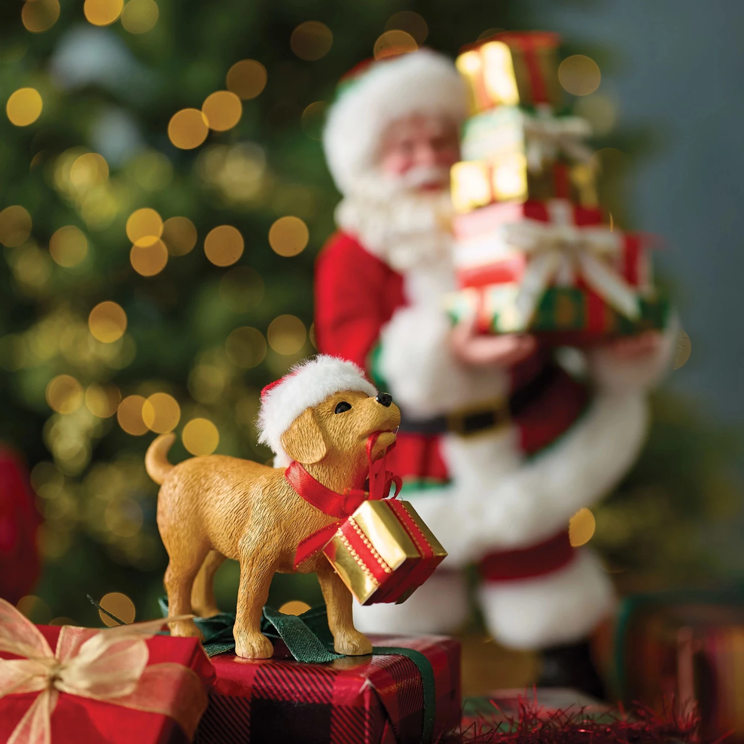 Santa’s best friend leans a paw to help carrying this large stack of shiny Christmas presents. This two piece set is the perfect gift for any dog lover.