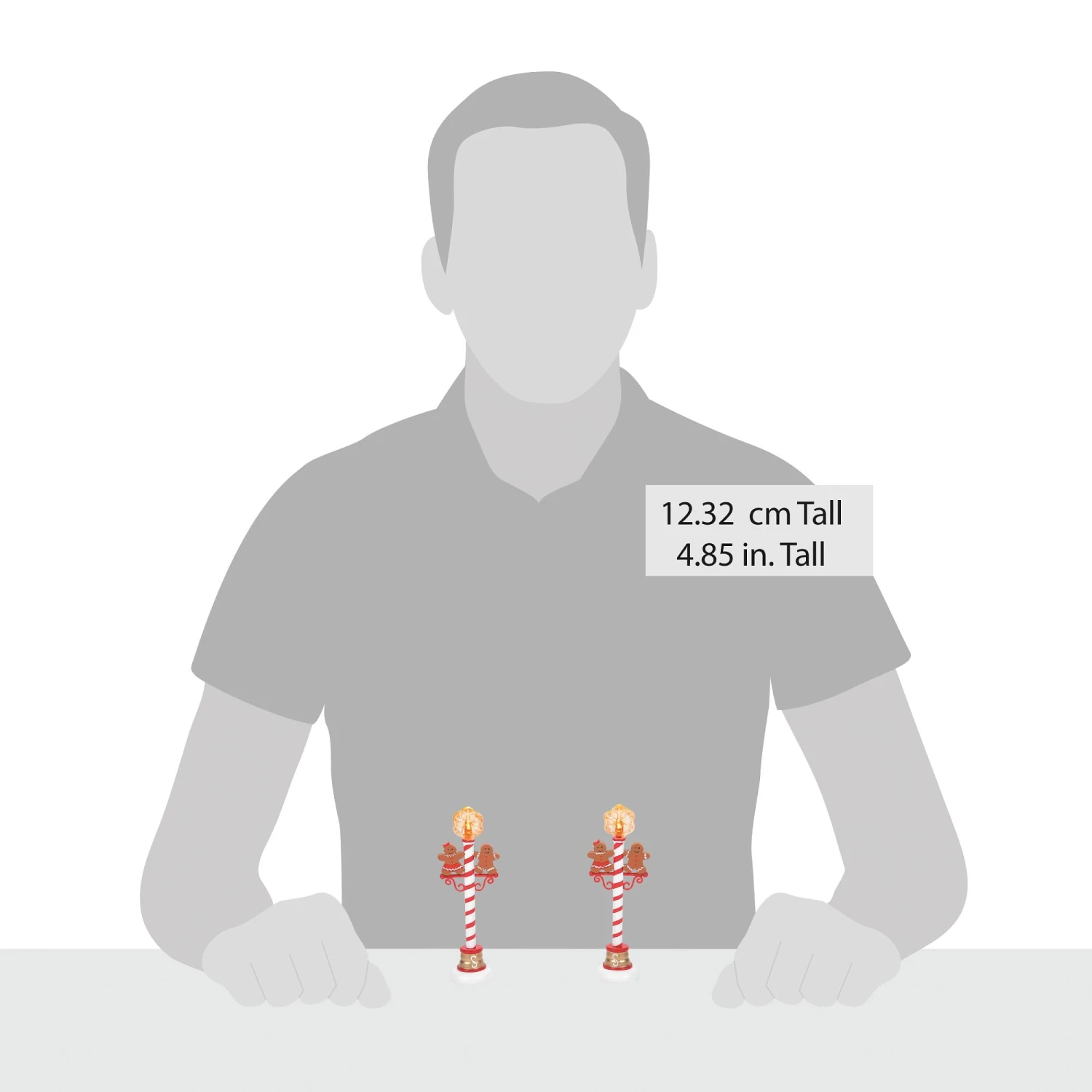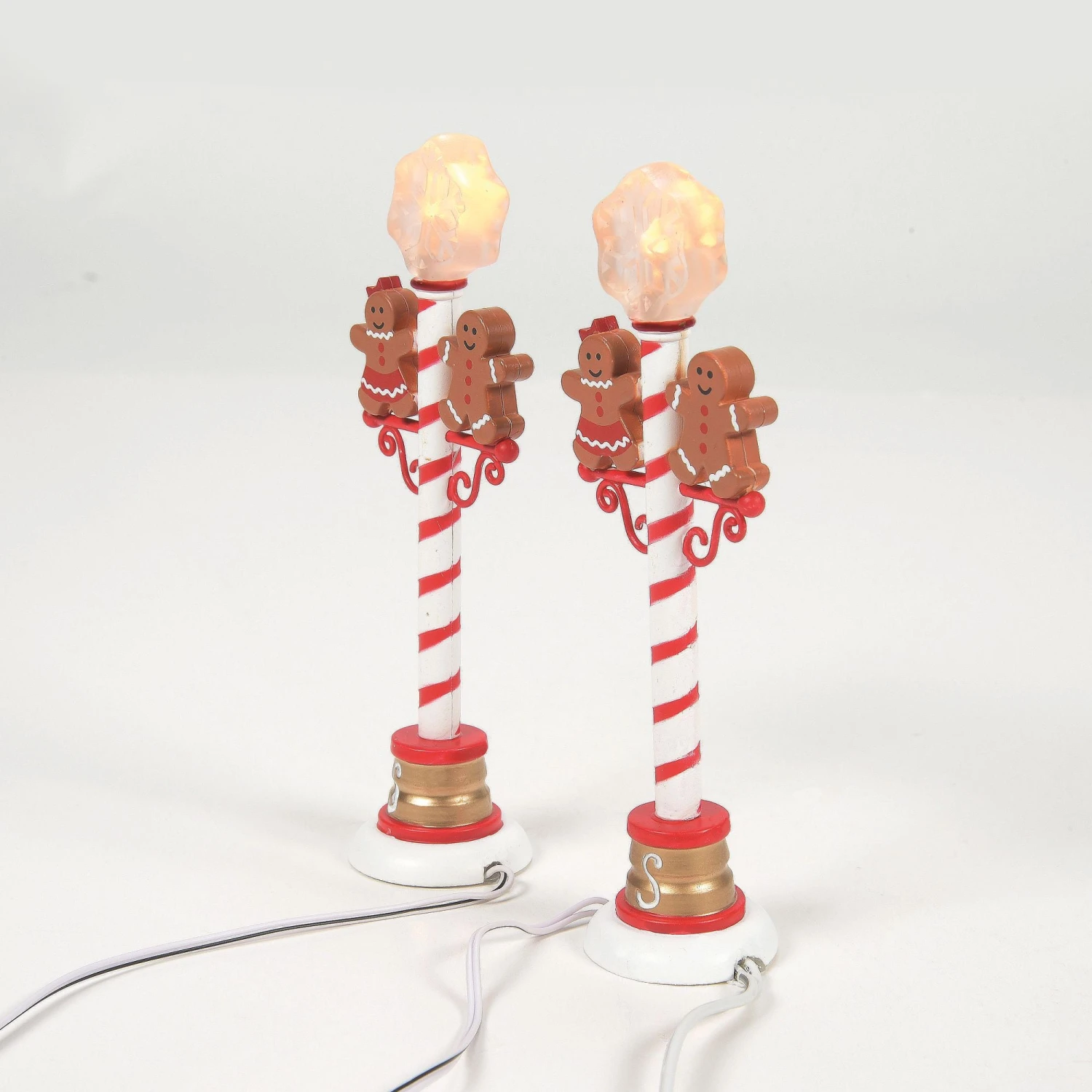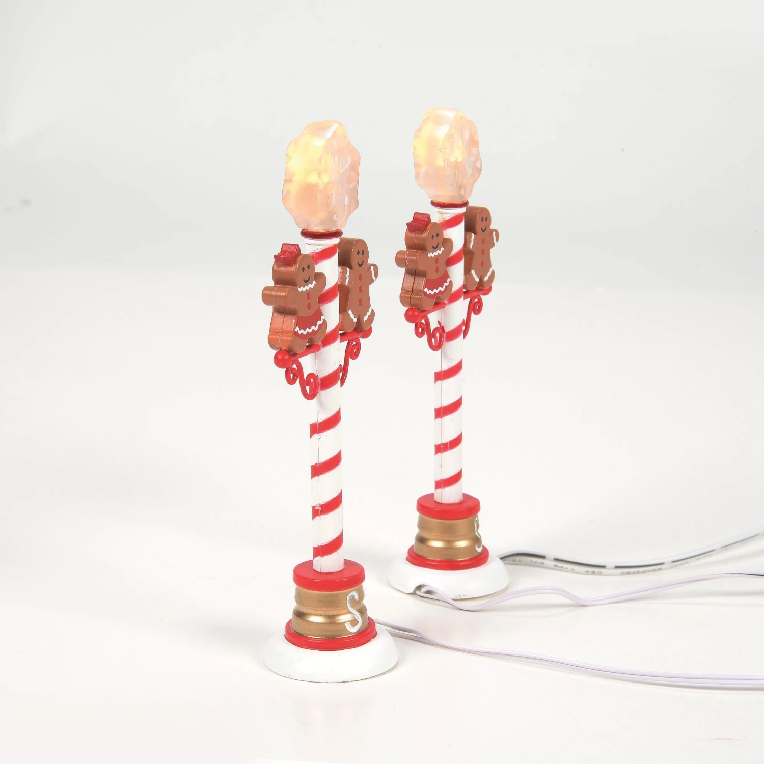 A pair of happy gingerbread figures dance atop these red and white striped street lamps. The lights are covered with LED snowflakes to make the season even brighter.