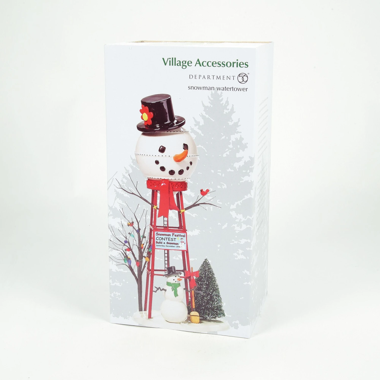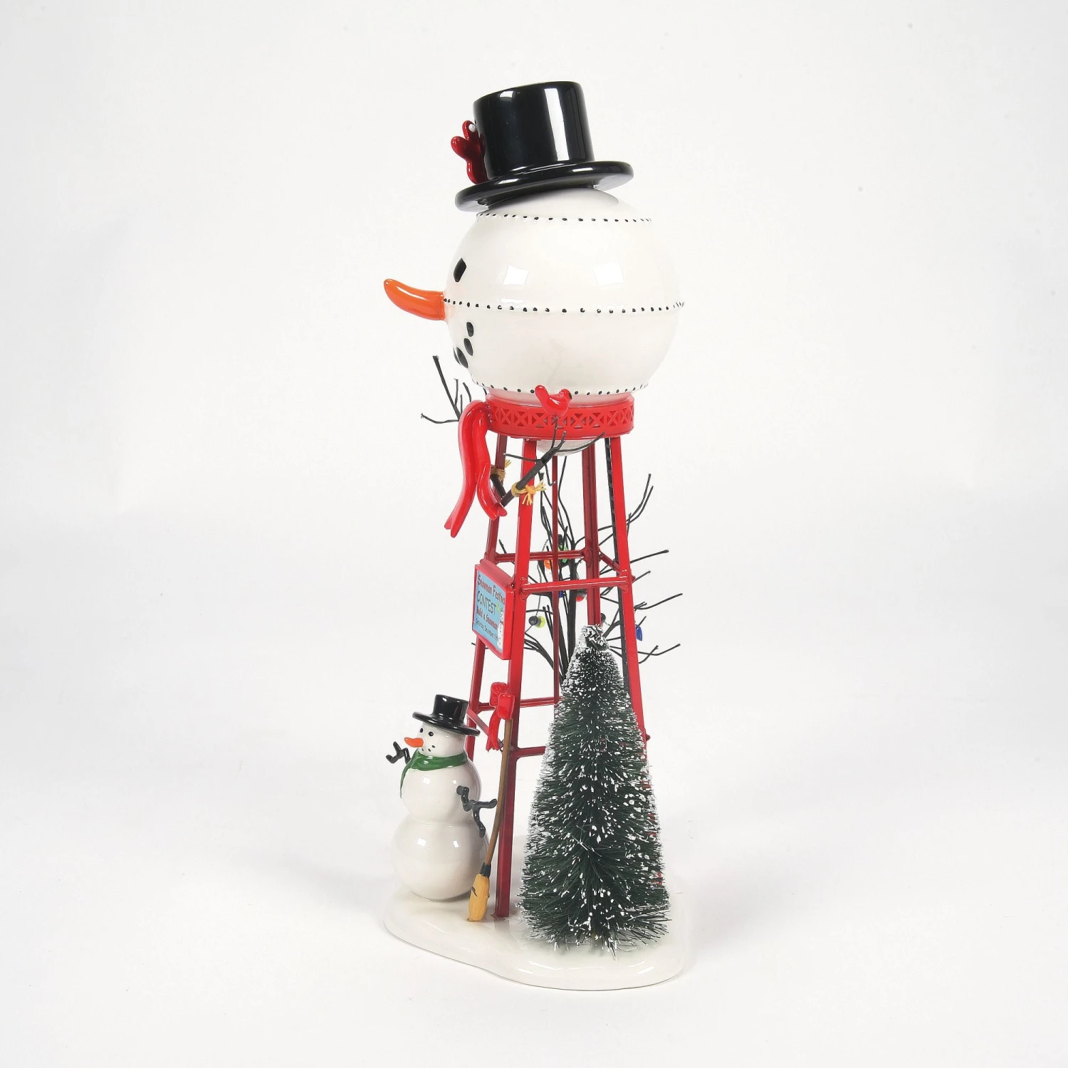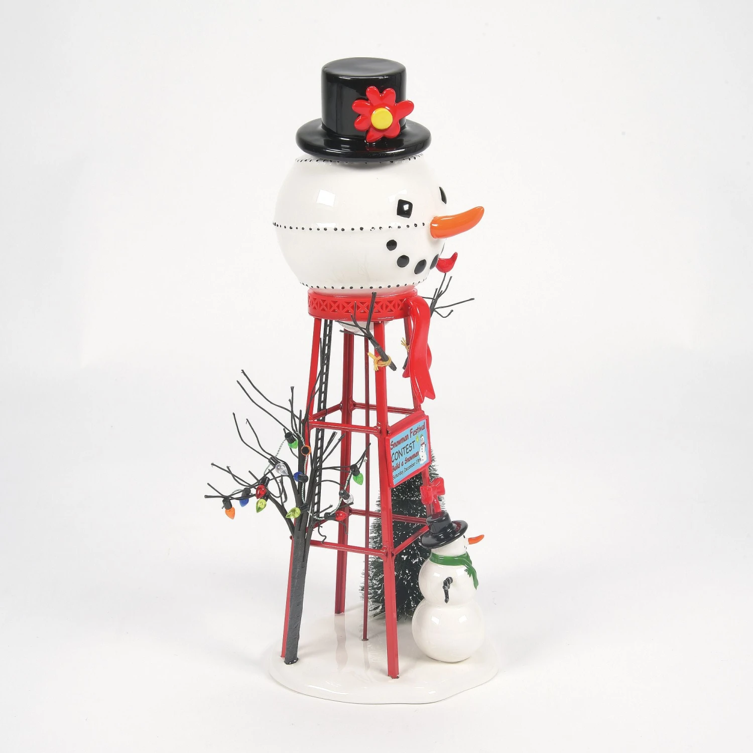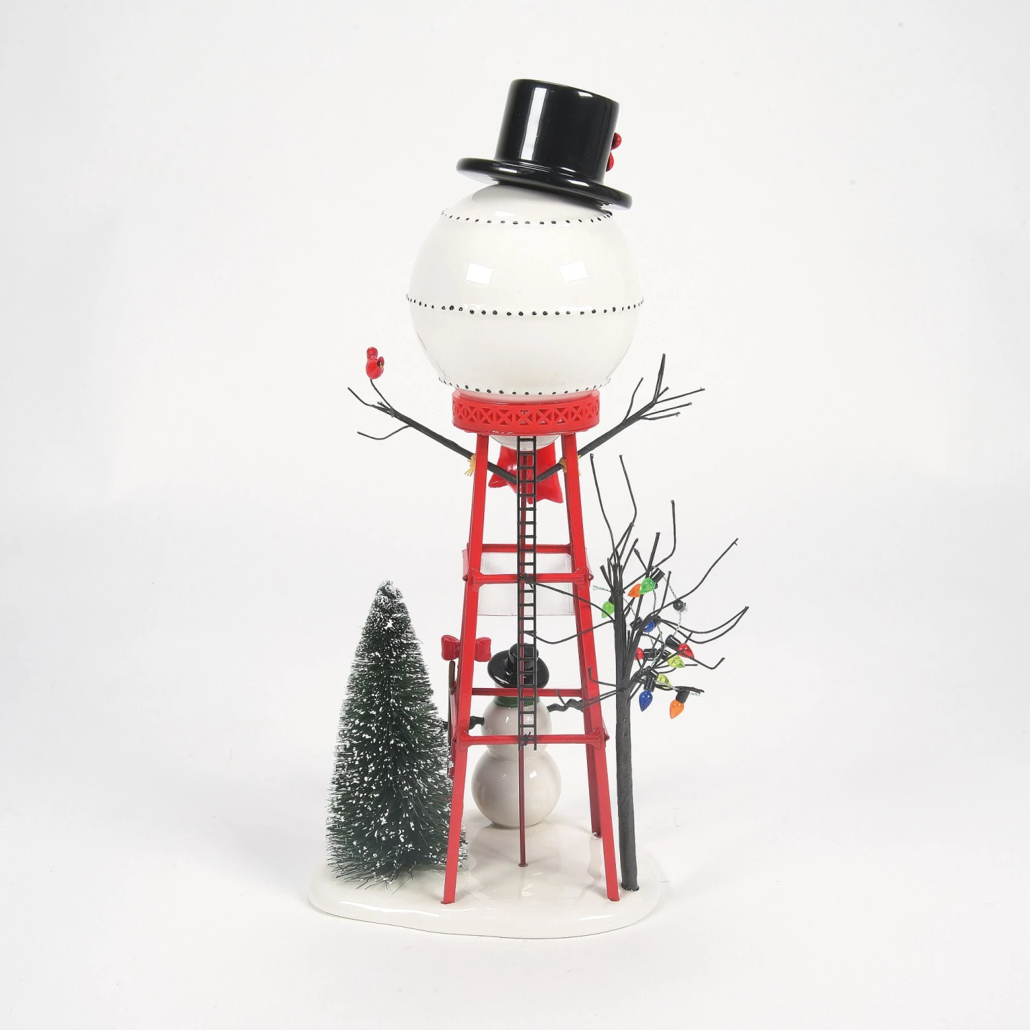 This snowman themed water tower is the perfect addition to your Christmas Village. Includes tree with holiday lights and sign promoting the local Snowman Festival. Made of ceramic and die cast.