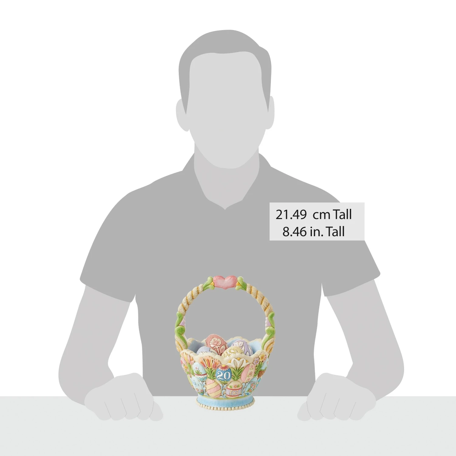 Beautifully designed by Jim Shore, this 20th Easter basket is the final introduction in the annual basket series. Featuring an intricate handle complimented by a heart. Egg embellishments from previous designs surround. 4 artists eggs included.