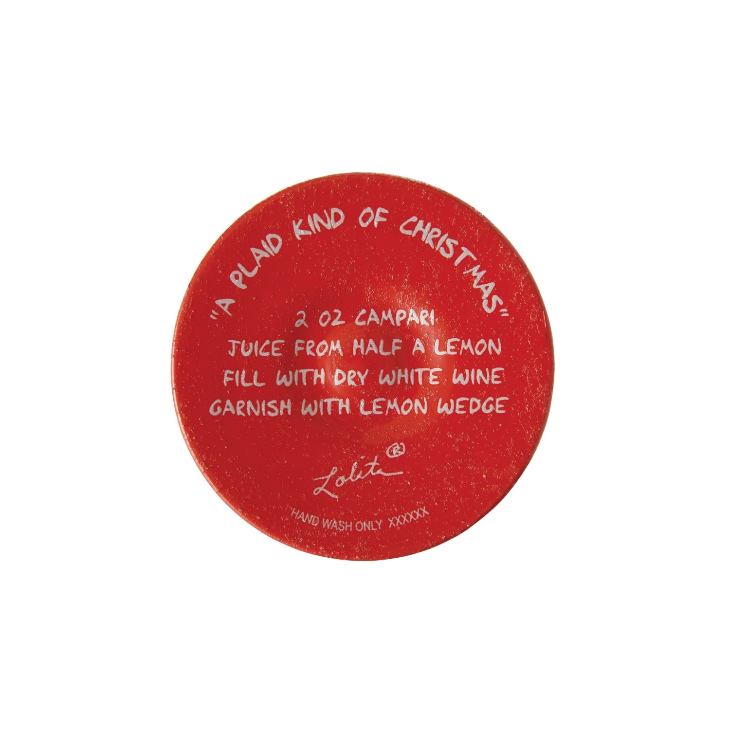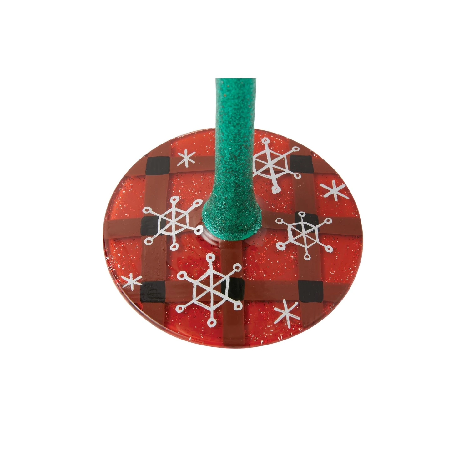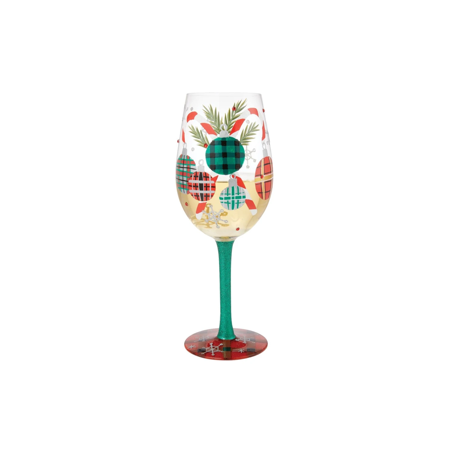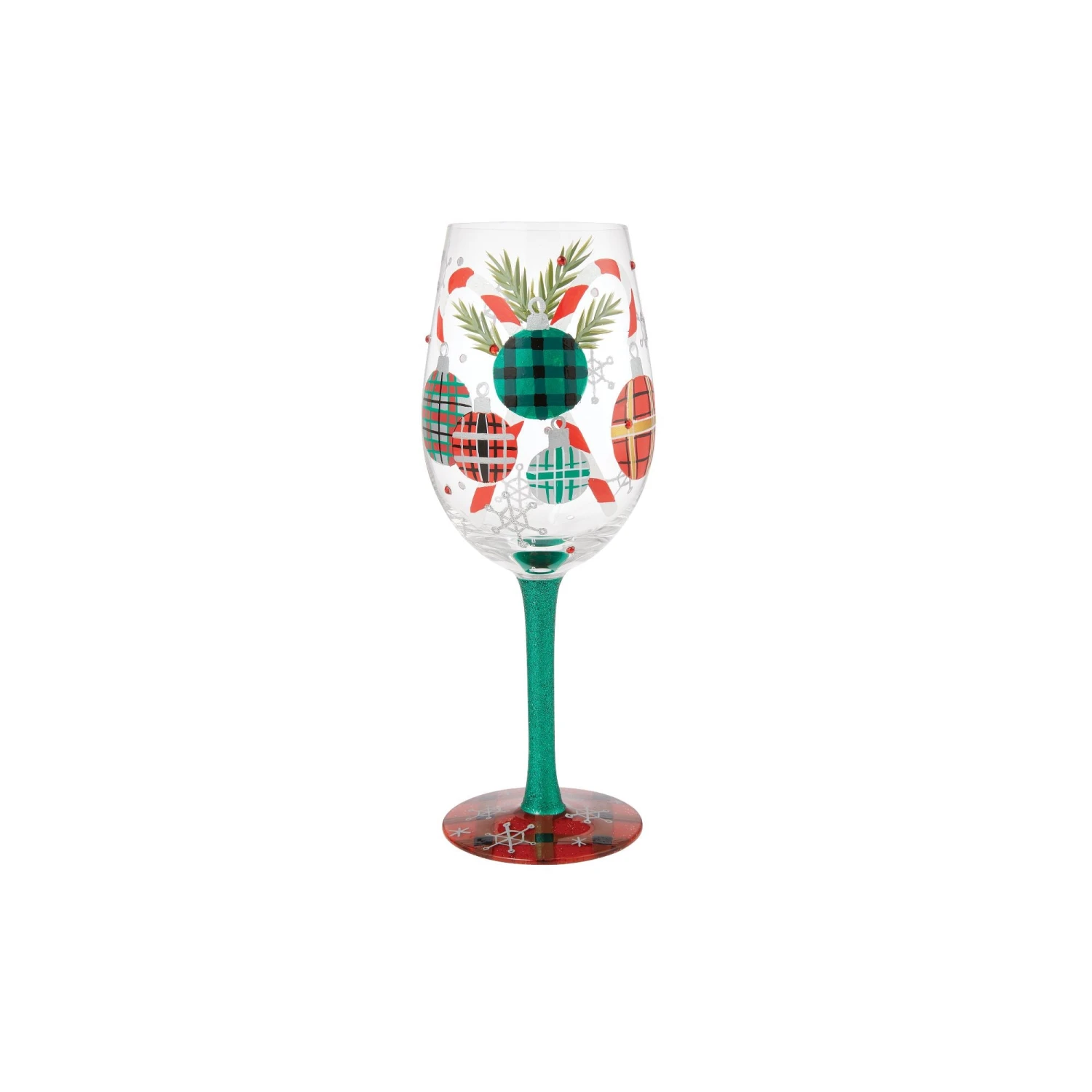 This festive hand-painted wine glass from Lolita features a collection of plaid ornaments with candy canes and holly. Inlaid crystal details and sparkling silver snowflakes inspire Christmas spirit while the cup’s green stem gleams with glitter.
