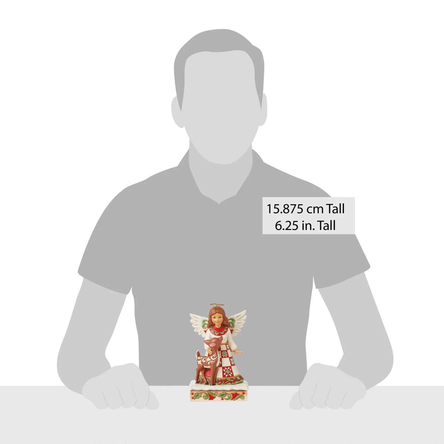 On a stage of flowers, a hallowed angel wears a red and green patchwork patterned dress with a smile. She pats a gentle fawn with a rosemaling pattern. The sweet Jim Shore modeled pair celebrate the simplicity of friendship and miracle of nature.