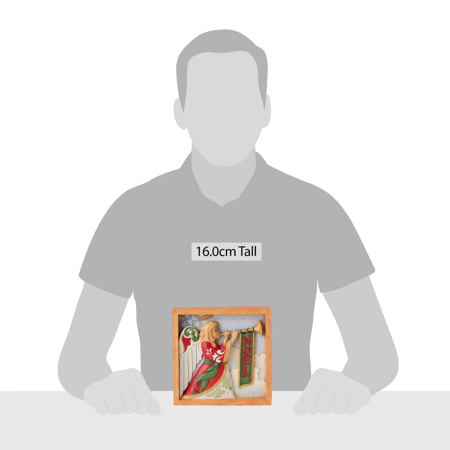 These hand painted decorative plaques by Jim Shore add a little wonder around the house. With detailed rosemåling and quilt art pattern these plaques add enchanting accent to any room. In this plaque an angel declares Christmas with a trumpet.