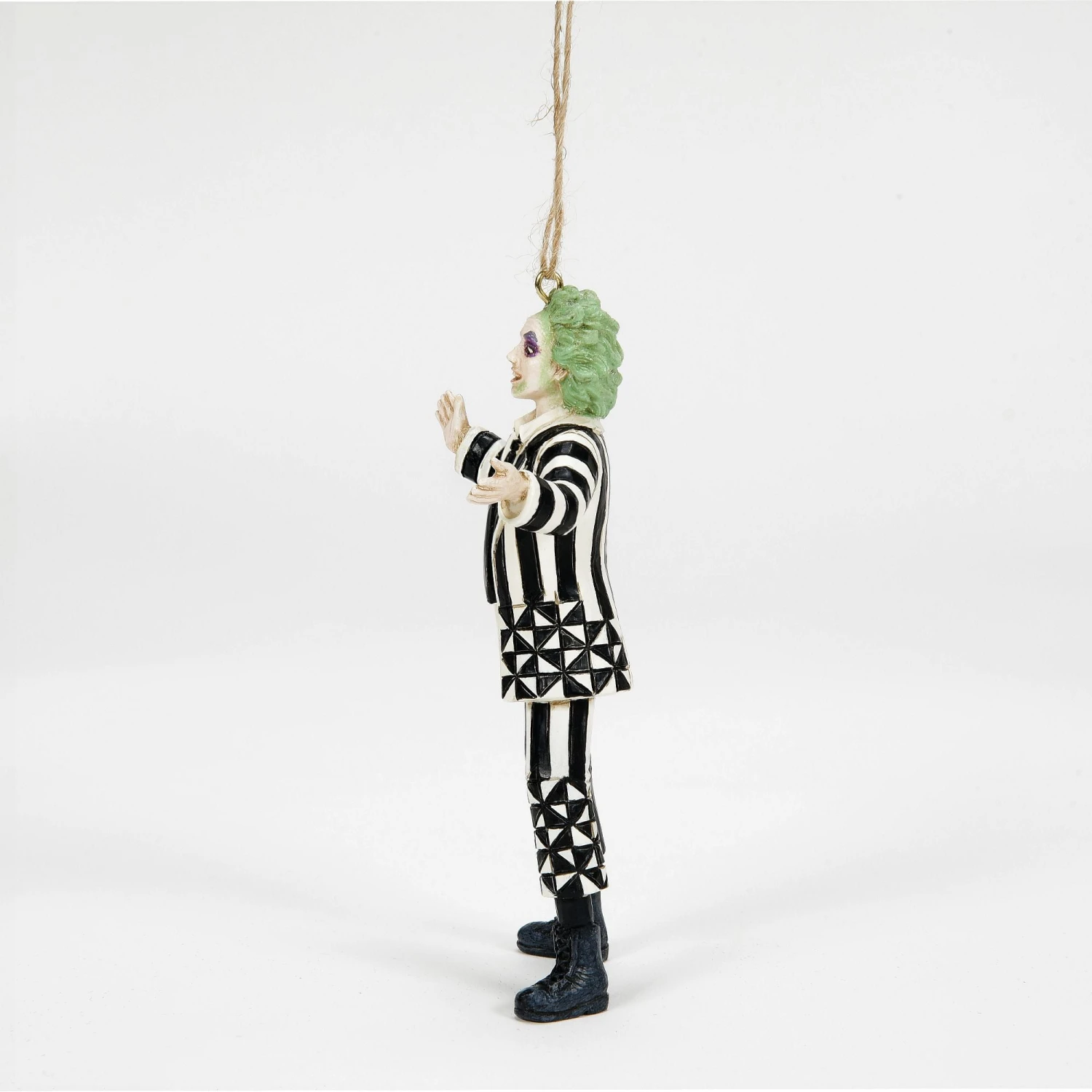 Capture the mischievous spirit of Beetlejuice in this festive Christmas ornament by Jim Shore. The ornament features Beetlejuice donning his iconic black and white striped suit, his classic grin, and disheveled green hair.