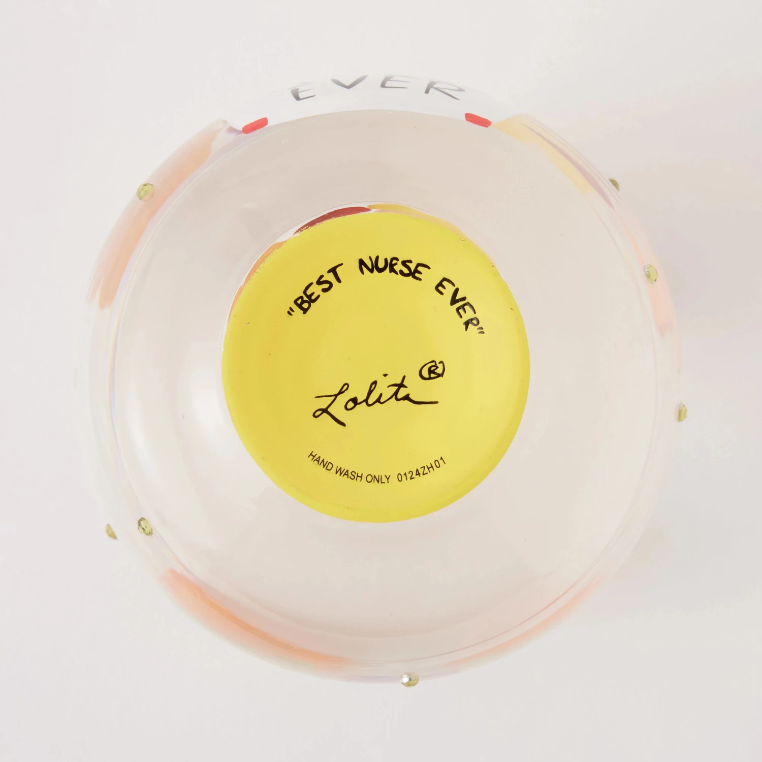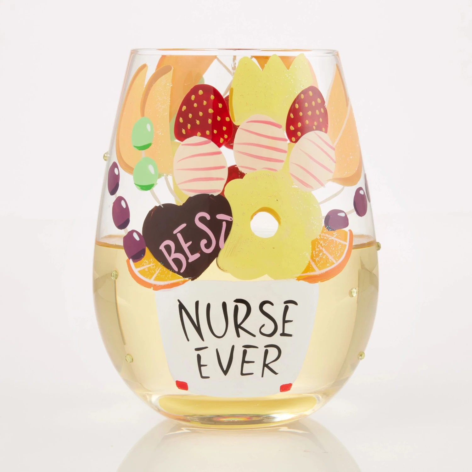 This gorgeous glass compliments with every sip. With the accolade of Best Nurse Ever written across a hand-painted potted plant, this stemless wine glass serves a creative edible arrangement bouquet with delightful color and care.