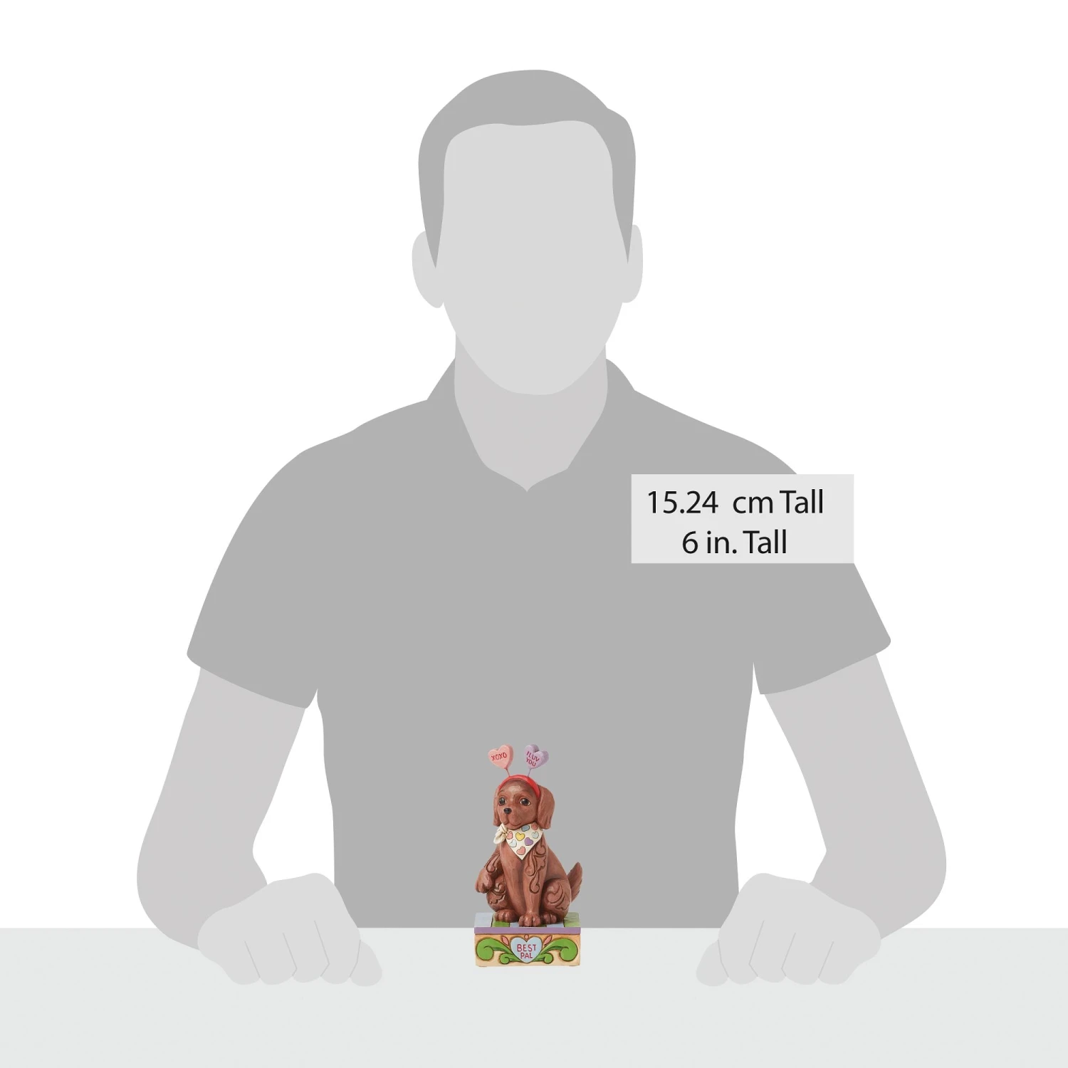 Inspired by Sweethearts candy, this Jim Shore crafted pup wears a bandana of colorful hearts and a headpiece inviting pets. With the artist’s iconic rosemaling on the dog’s fur, this adorable canine invites hugs and snuggles this Valentine’s Day.