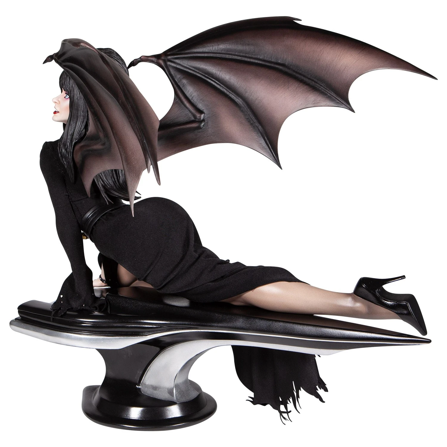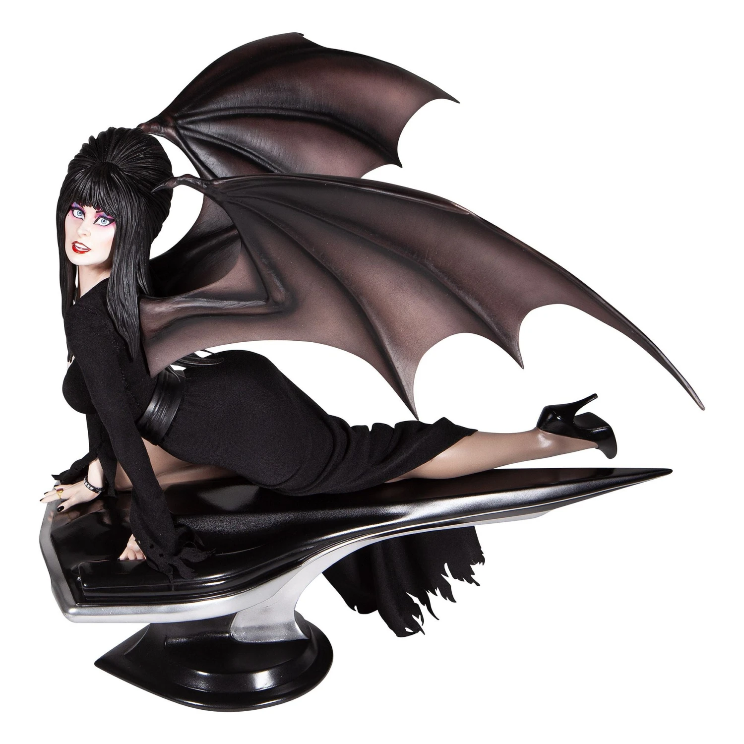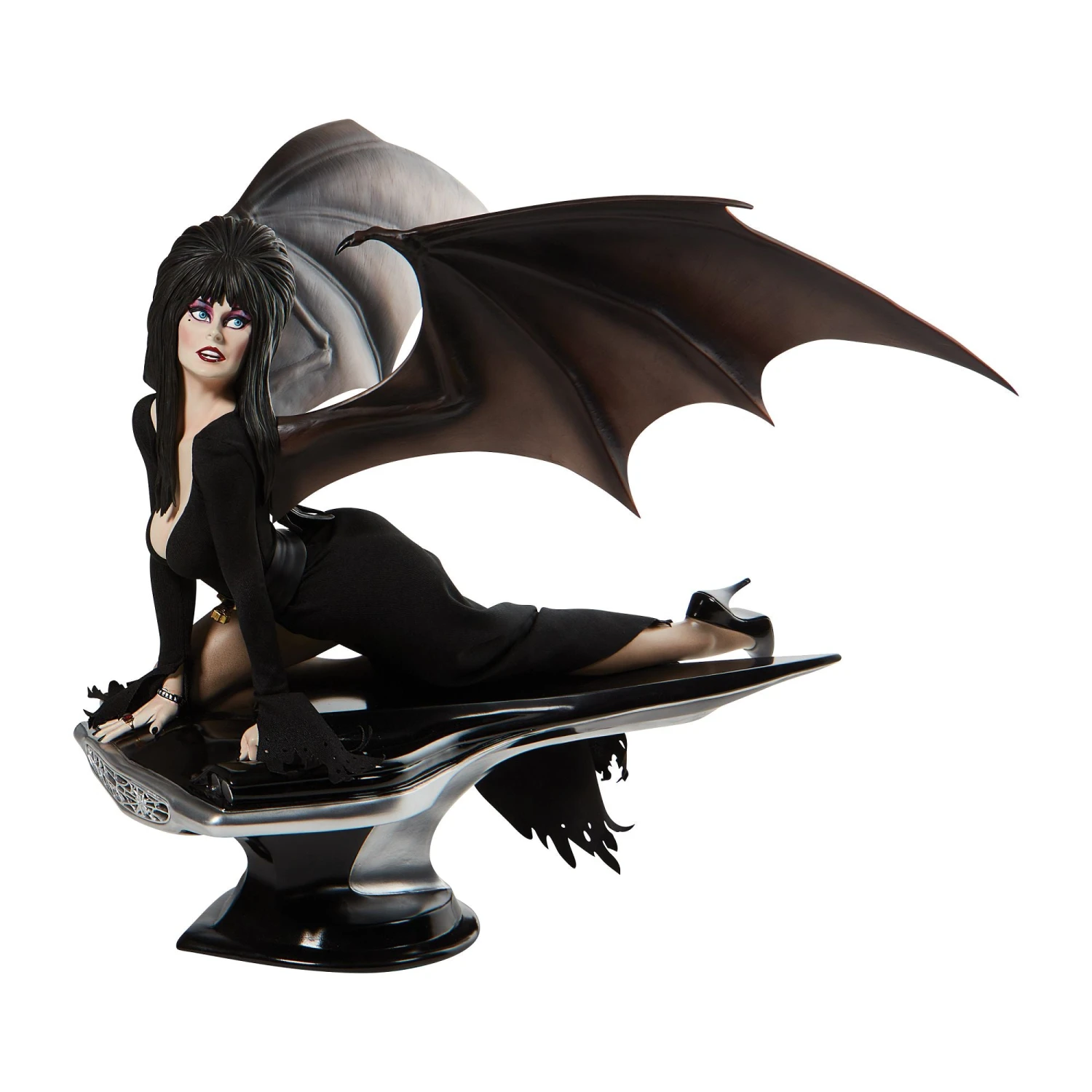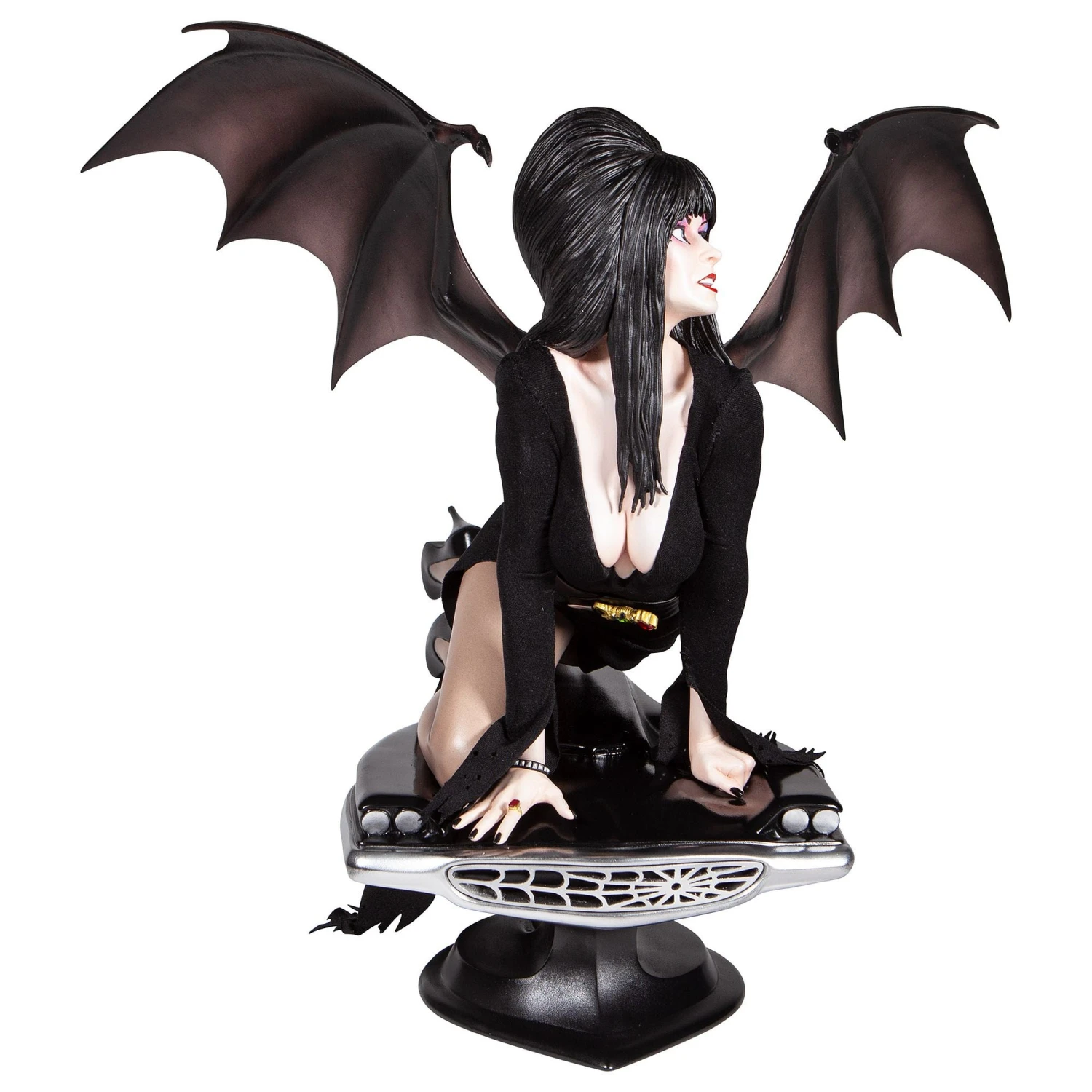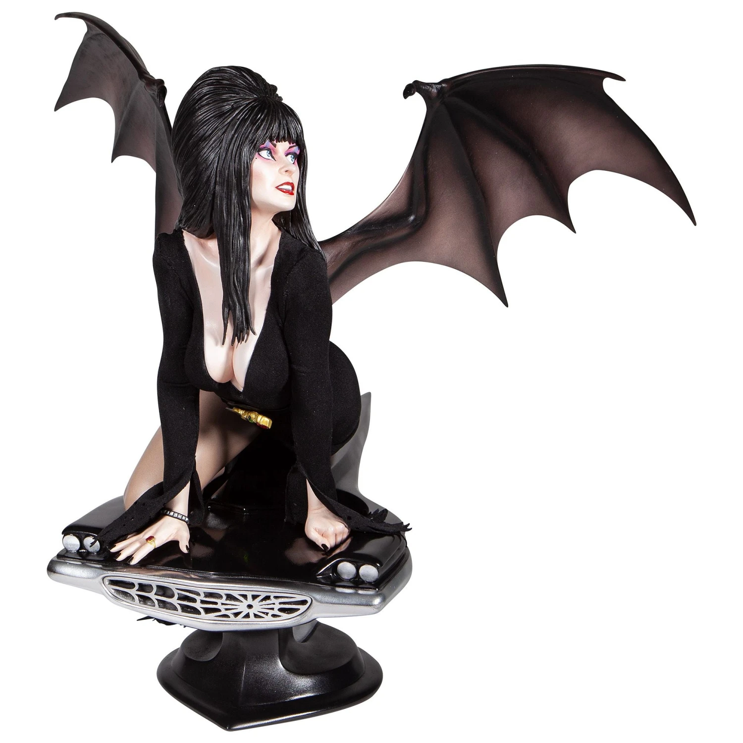 - Bat-like wings extend from Elvira’s shoulders (detachable)
