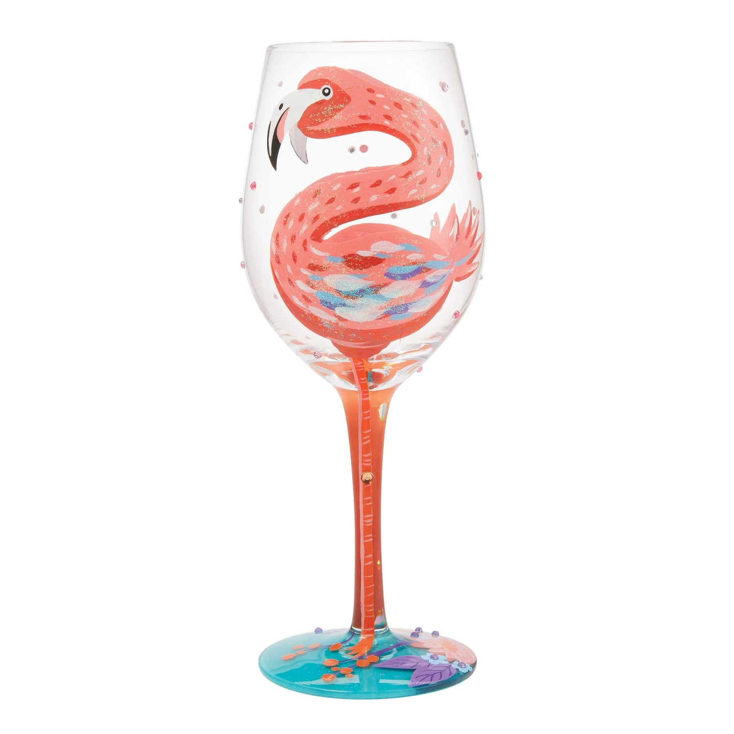 Indulge in the funky elegance of Lolita Designs with this playful wine glass, showcasing two pink flamingos standing on a base of colorful flowers. The cup sparkles with brilliant gems, adding a touch of intrigue to every sip. Make today fabulous!