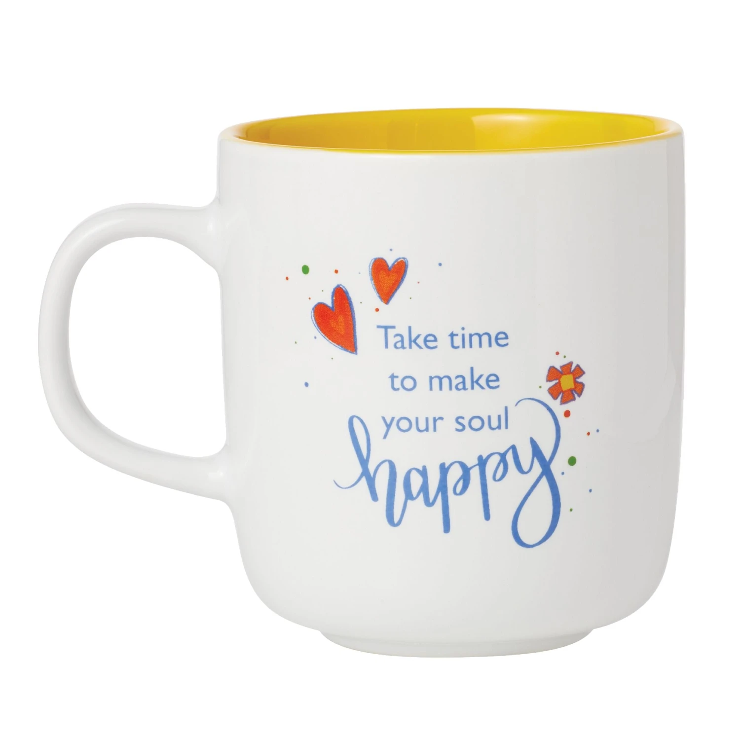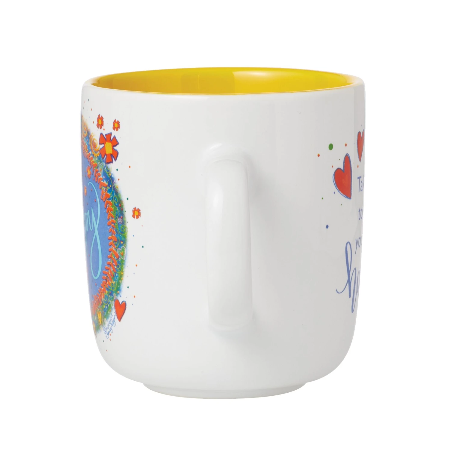This colorful cup will help you start your morning with a positive perspective and set your mood right for the day. Inside a vibrant frame of hearts, the word happy is written in curly script. A moving quote reminds us to enjoy life’s moments.