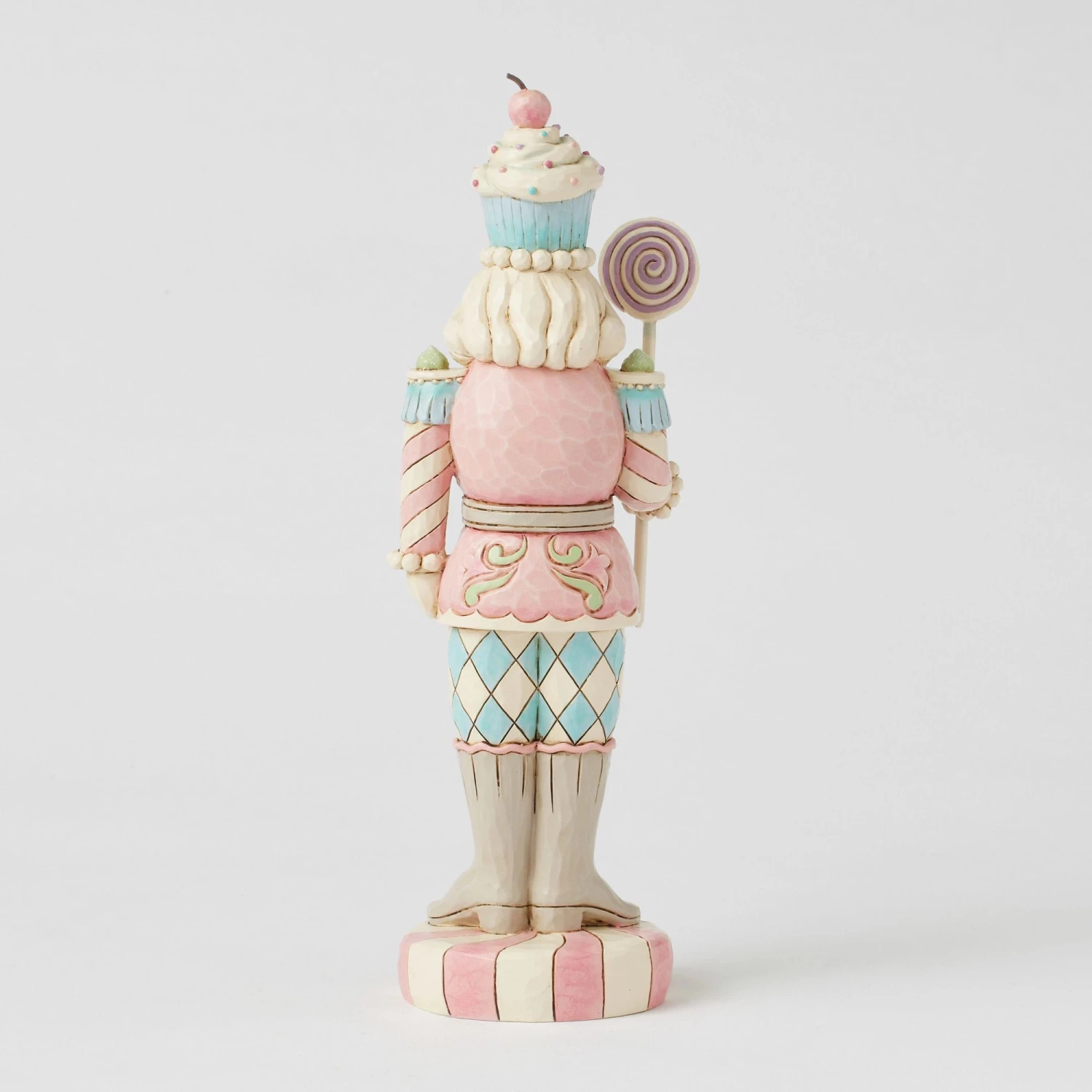 This Heartwood Sweets toy soldier design by Jim Shore stands proudly on a peppermint base, holding a lollipop staff. With a pastel-patterned uniform of icing and gumdrops, complete with a peppermint belt buckle and a delightful cupcake hat, he brings sw