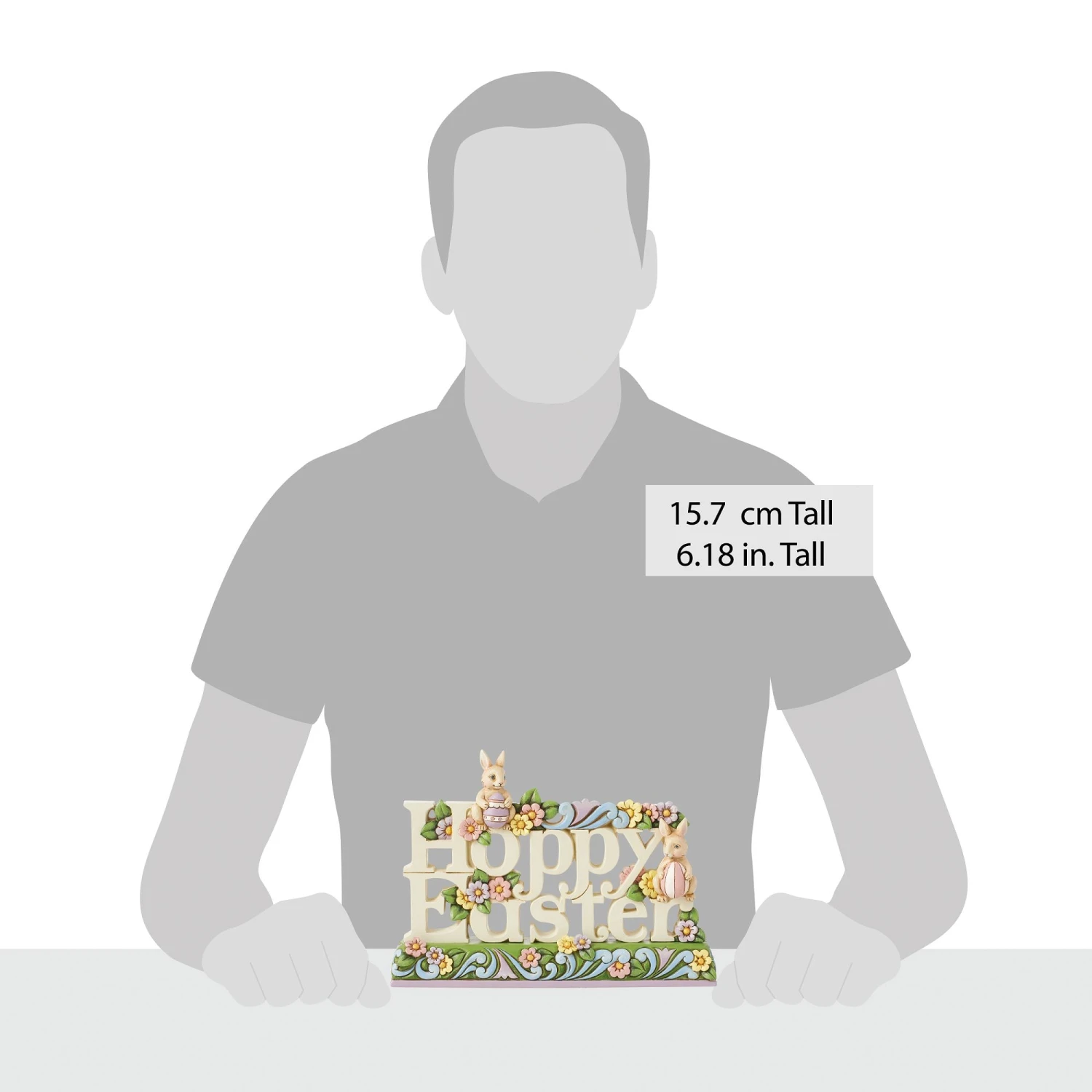 This colorful sign is a charming addition to your holiday home decor. With a kaleidoscope of flowers and two cheerful bunnies with painted eggs, this Easter text figurine by Jim Shore wishes you a “Hoppy Easter” with vibrant petals and rosemaling.