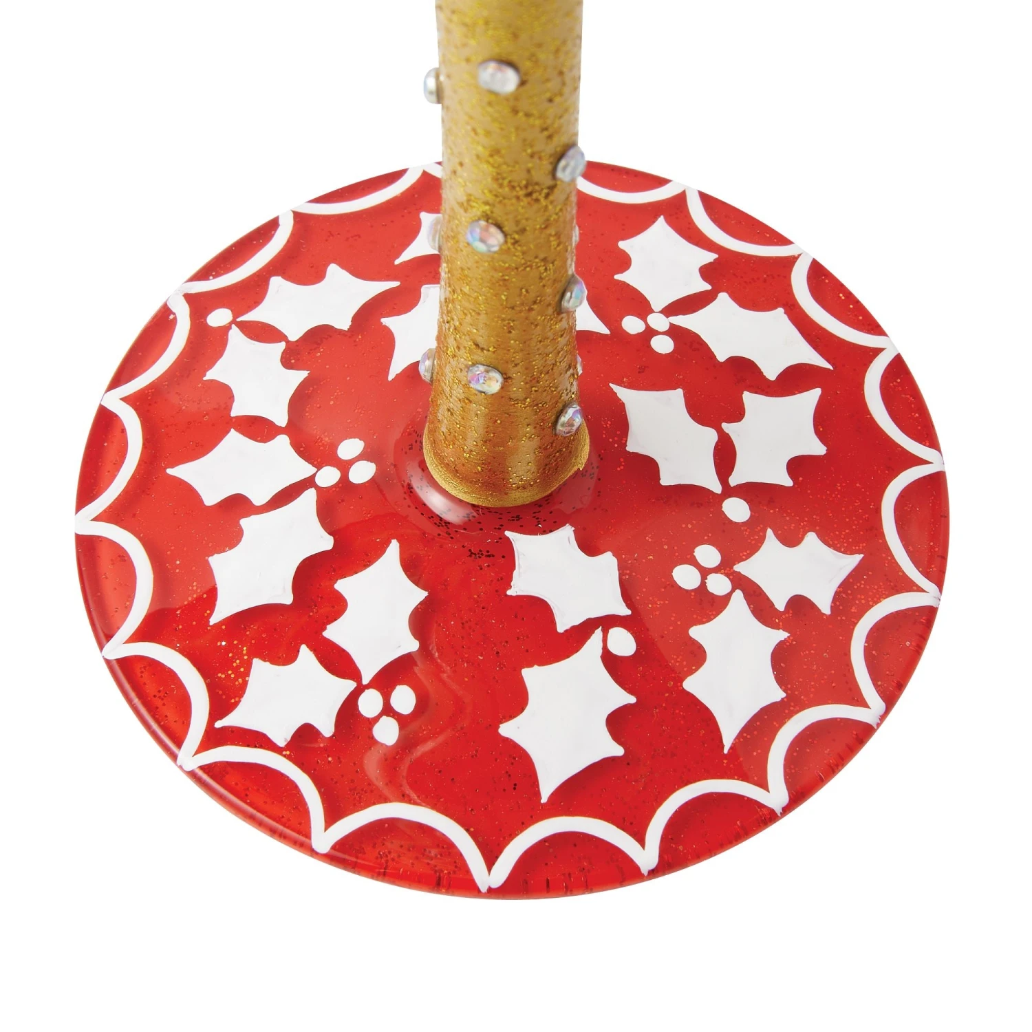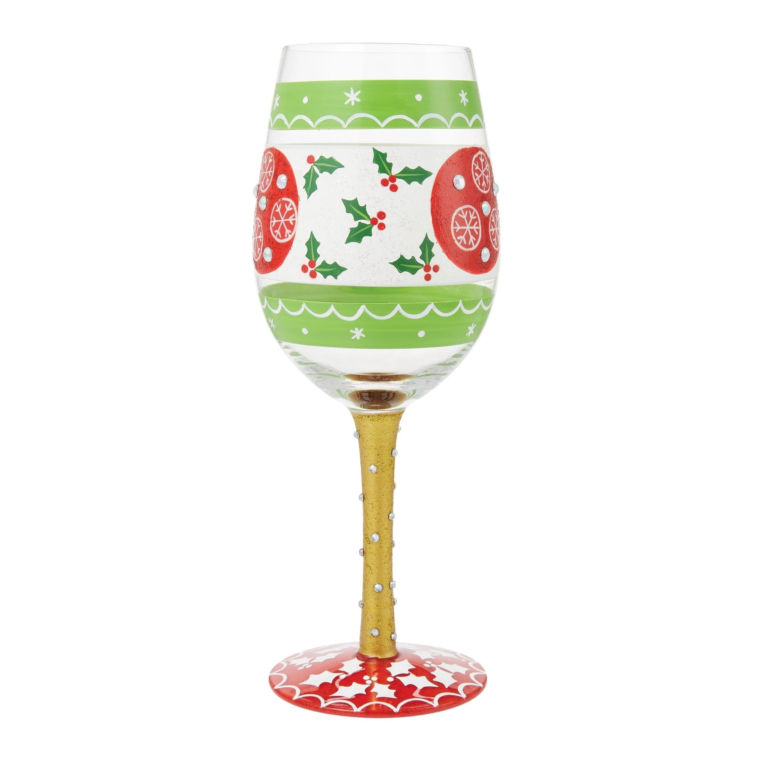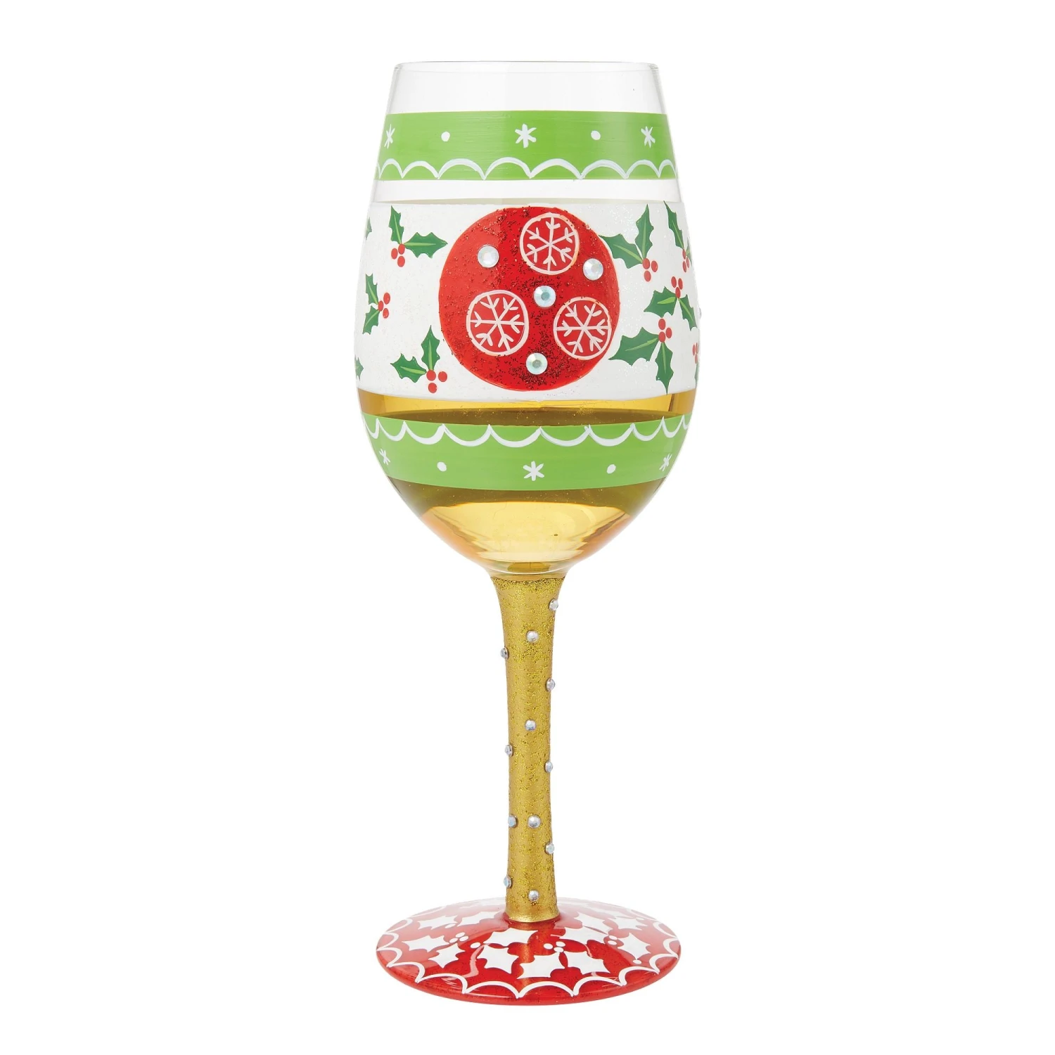 This gorgeous hand-painted wine glass from Lolita is a cup full of Christmas cheer! With alluring red and green pattering, sparkling crystal details, shimmering gold stem, and lots of mistletoe, this cup shares holiday joy with every sip.