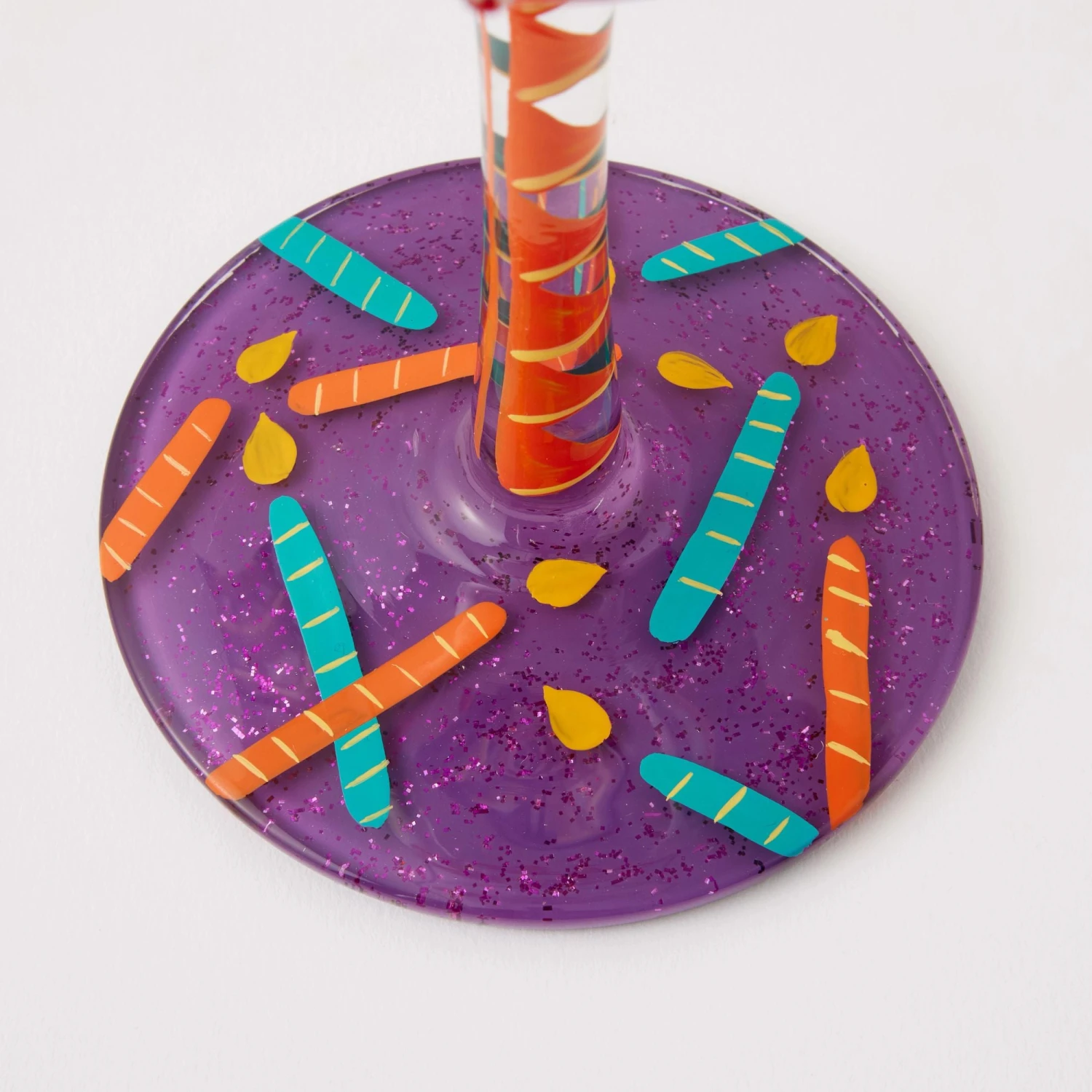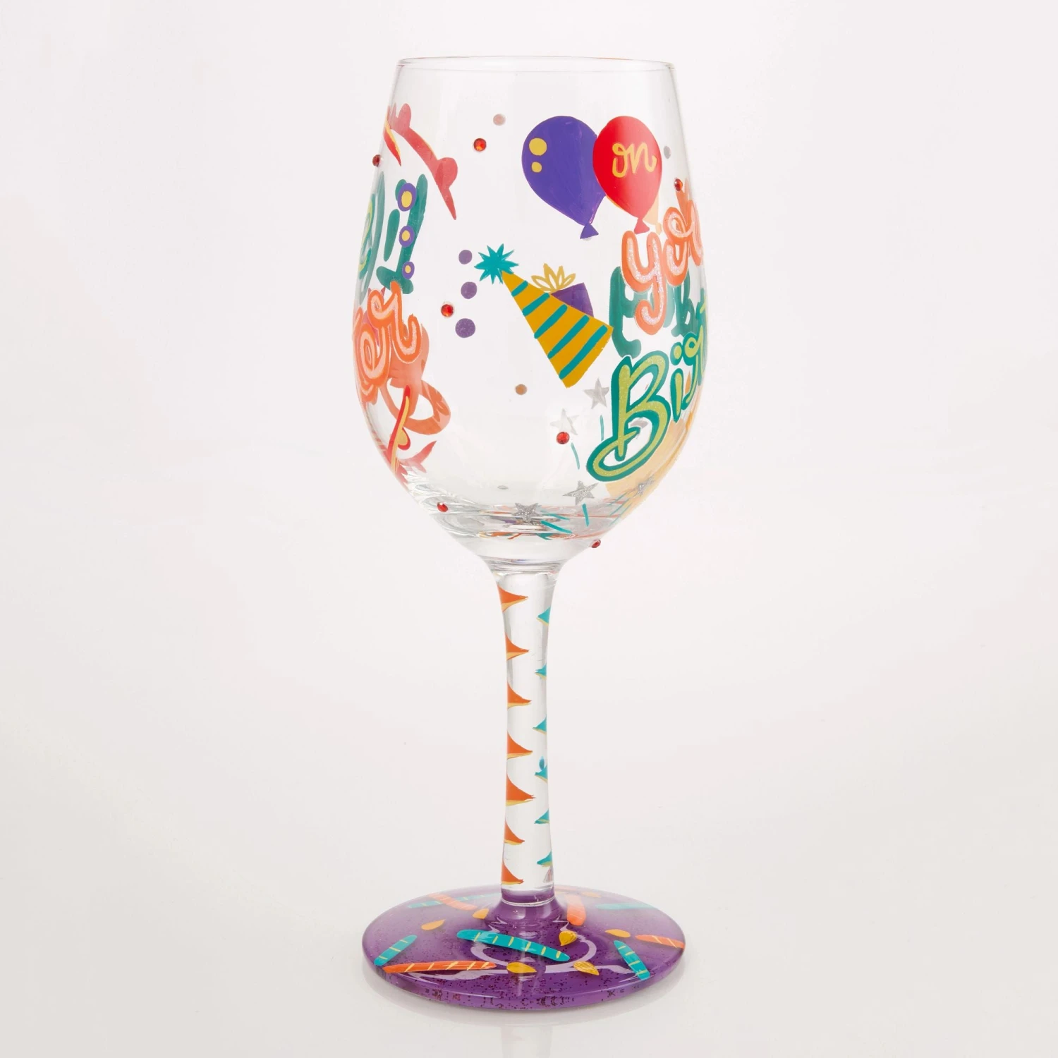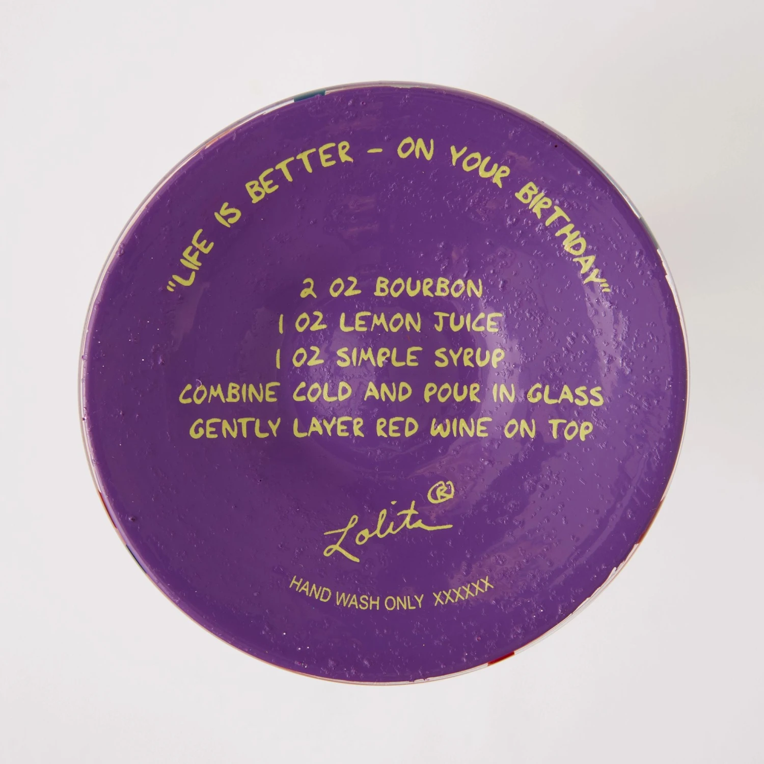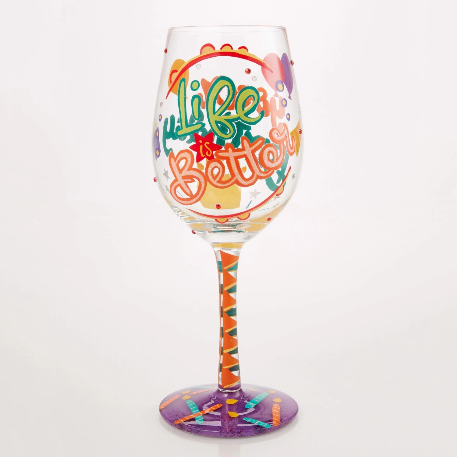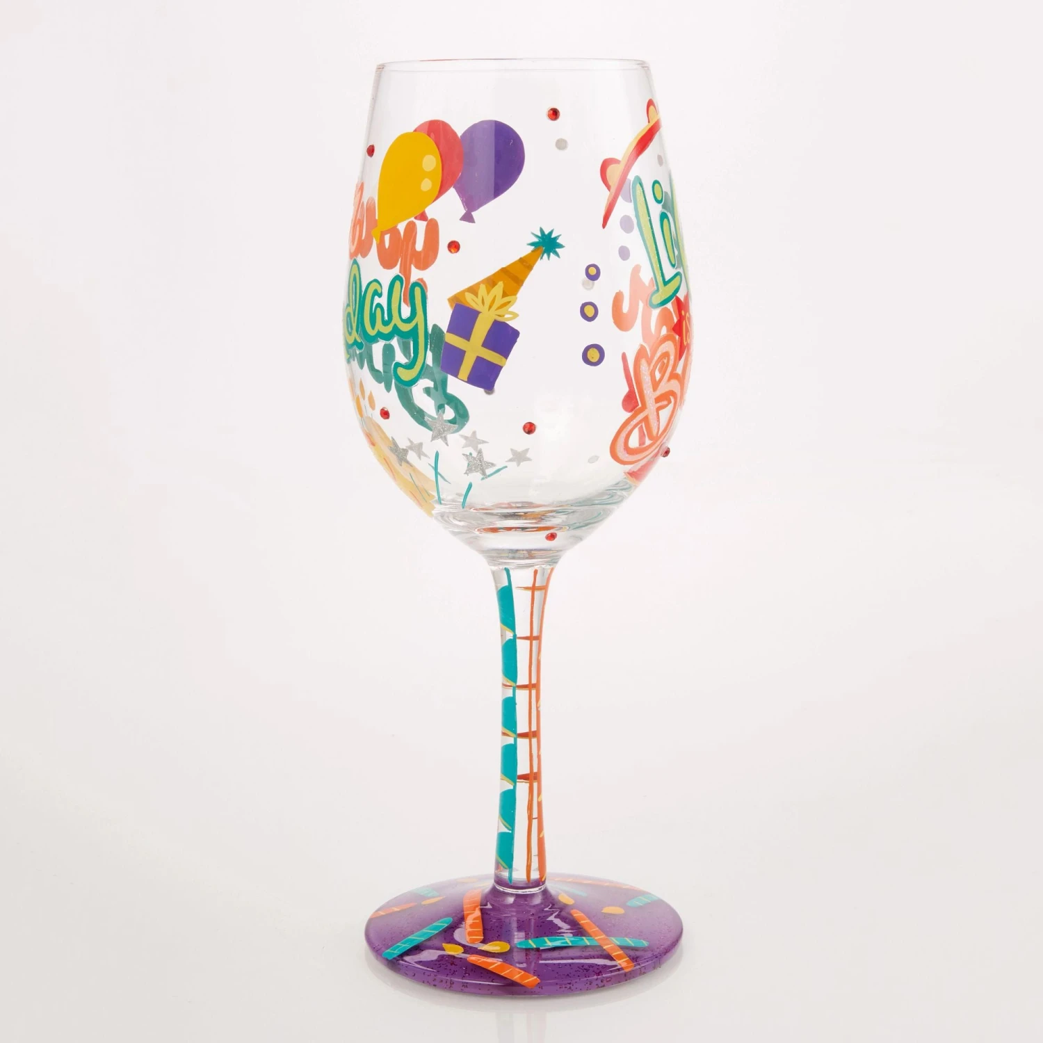 Celebrate in style with this vibrant Lolita wine glass, featuring party hats, presents, cake, and confetti in teals, oranges, purples, and yellows. The message “Life is Better on Your Birthday” and a special recipe make it the perfect birthday toast!