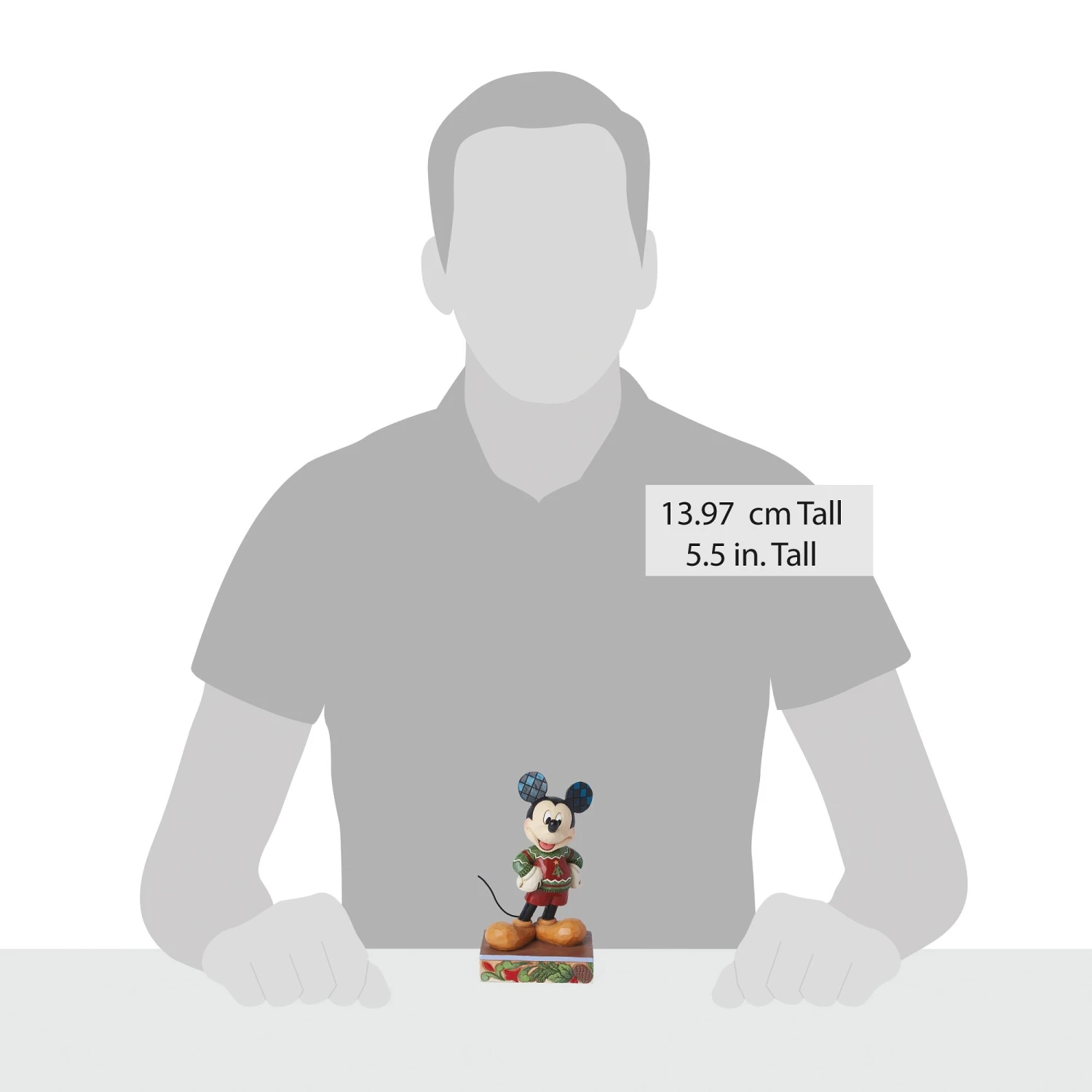 This festive design of Mickey Mouse from Jim Shore features the iconic character wearing a holiday sweater and a smile. Hands on his hips, Mickey proudly shows off his red and green threads. He stands on a stage of mistletoe and rosemale.