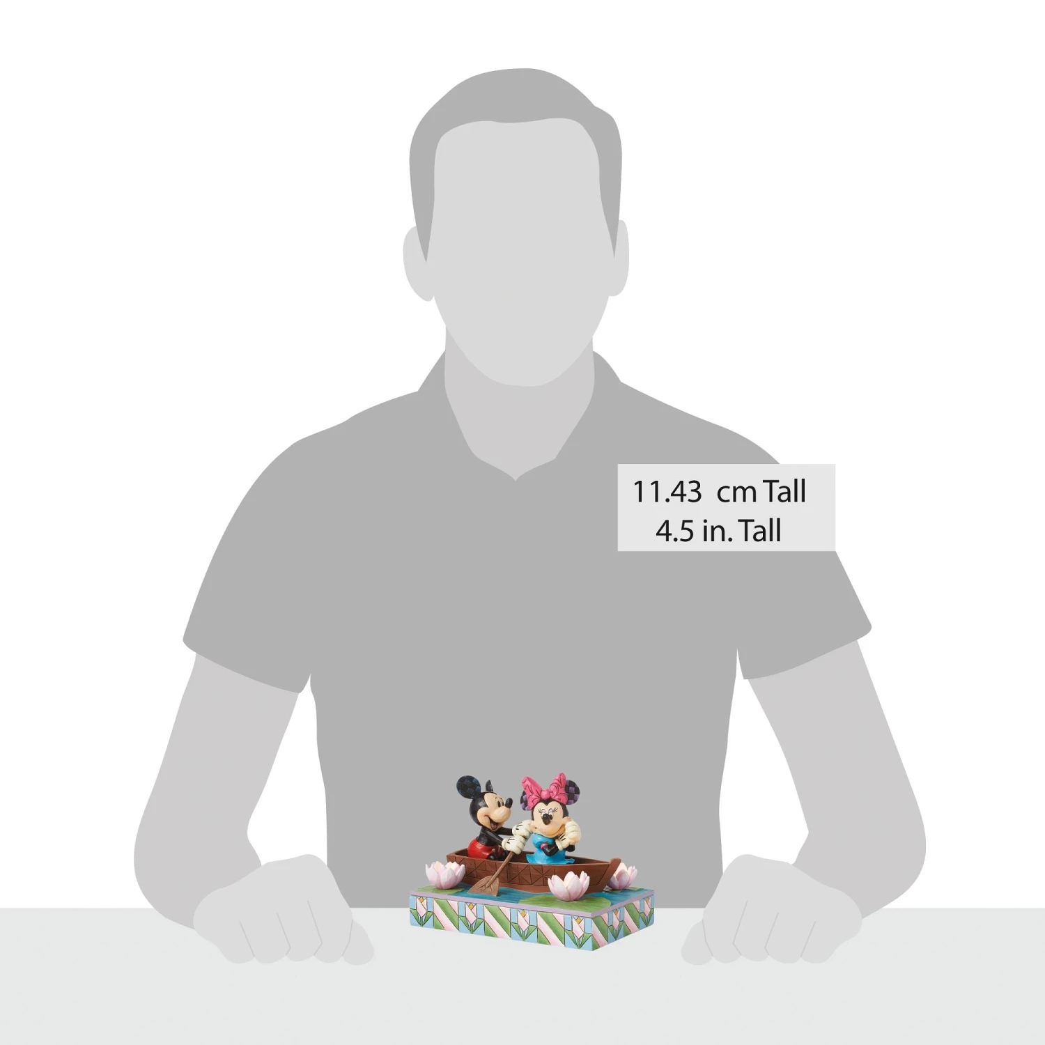 Jim Shore creates a romantic scene of beloved characters, Mickey and Minnie Mouse aboard a quaint rowboat bathed in the glow of tranquility. Amidst the serenity of nature, blooming flowers adorn their river rendezvous as the two love birds float on.