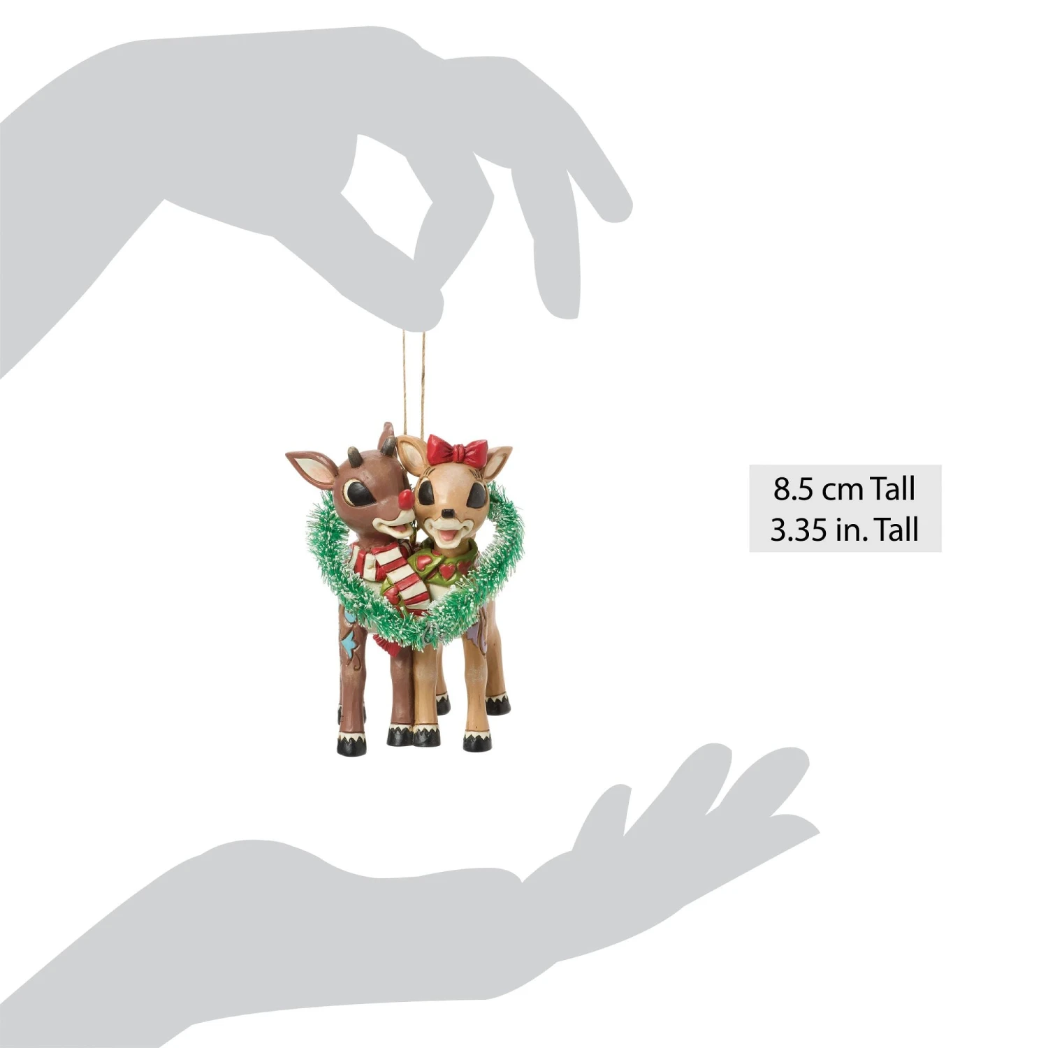 Celebrate the holidays with this Jim Shore ornament featuring Rudolph and Clarice, the reindeer charming couple framed within a real sisal heart wreath. As they walk together their scarves are entwined, capturing the magic of the season.