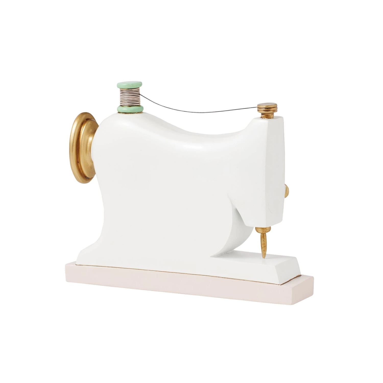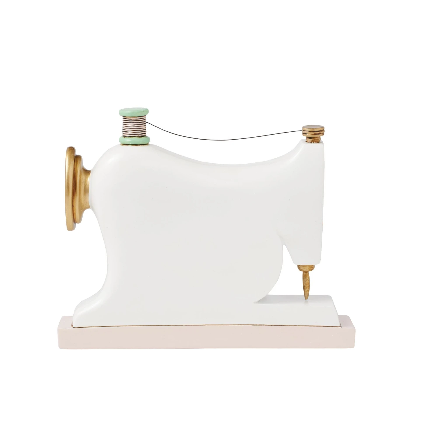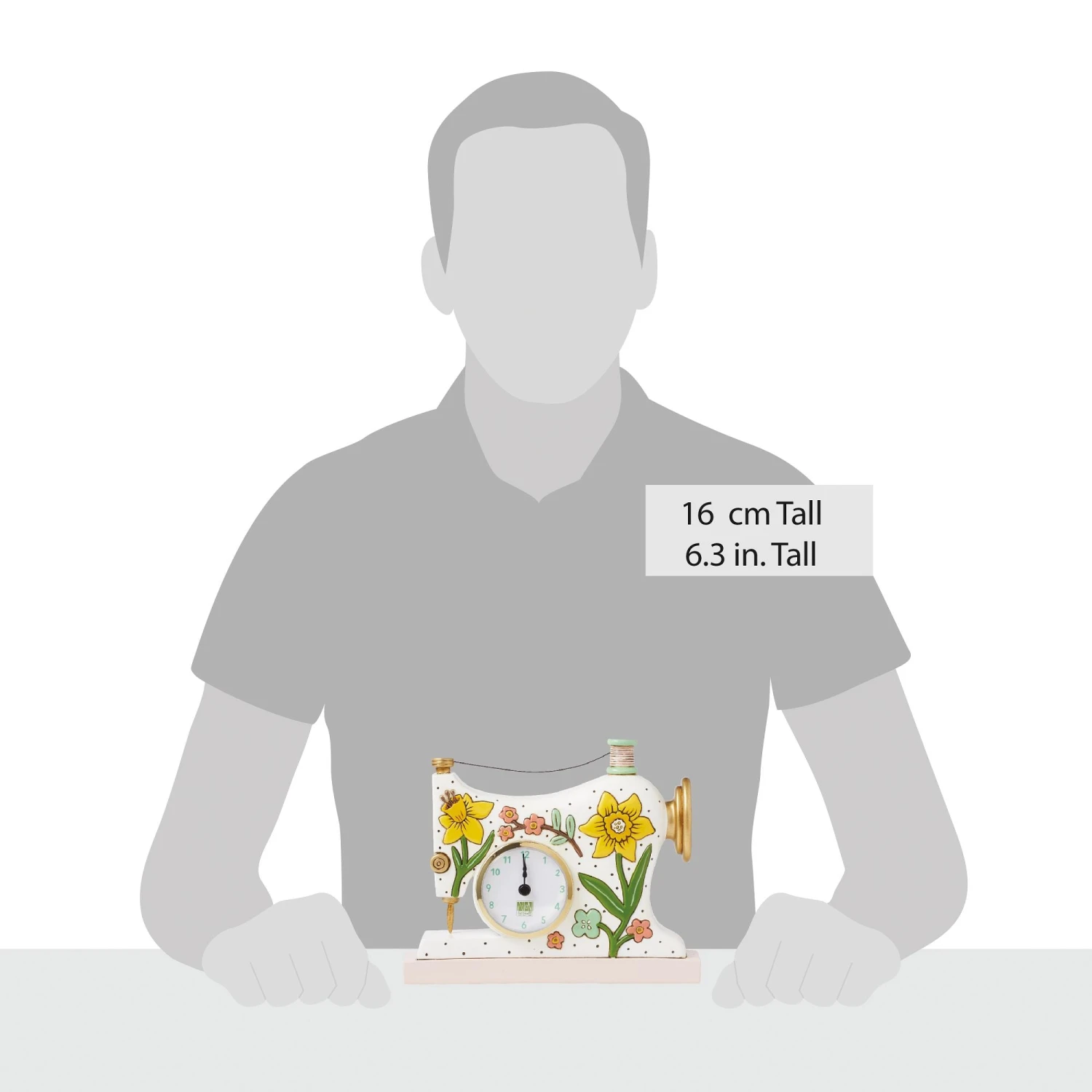 This inspired clock from Allen Designs is in the shape of a vintage sewing machine with floral details. The white machine features a golden needle and wheel. The machine is covered in colorful flowers blooms and a beautiful clock face.