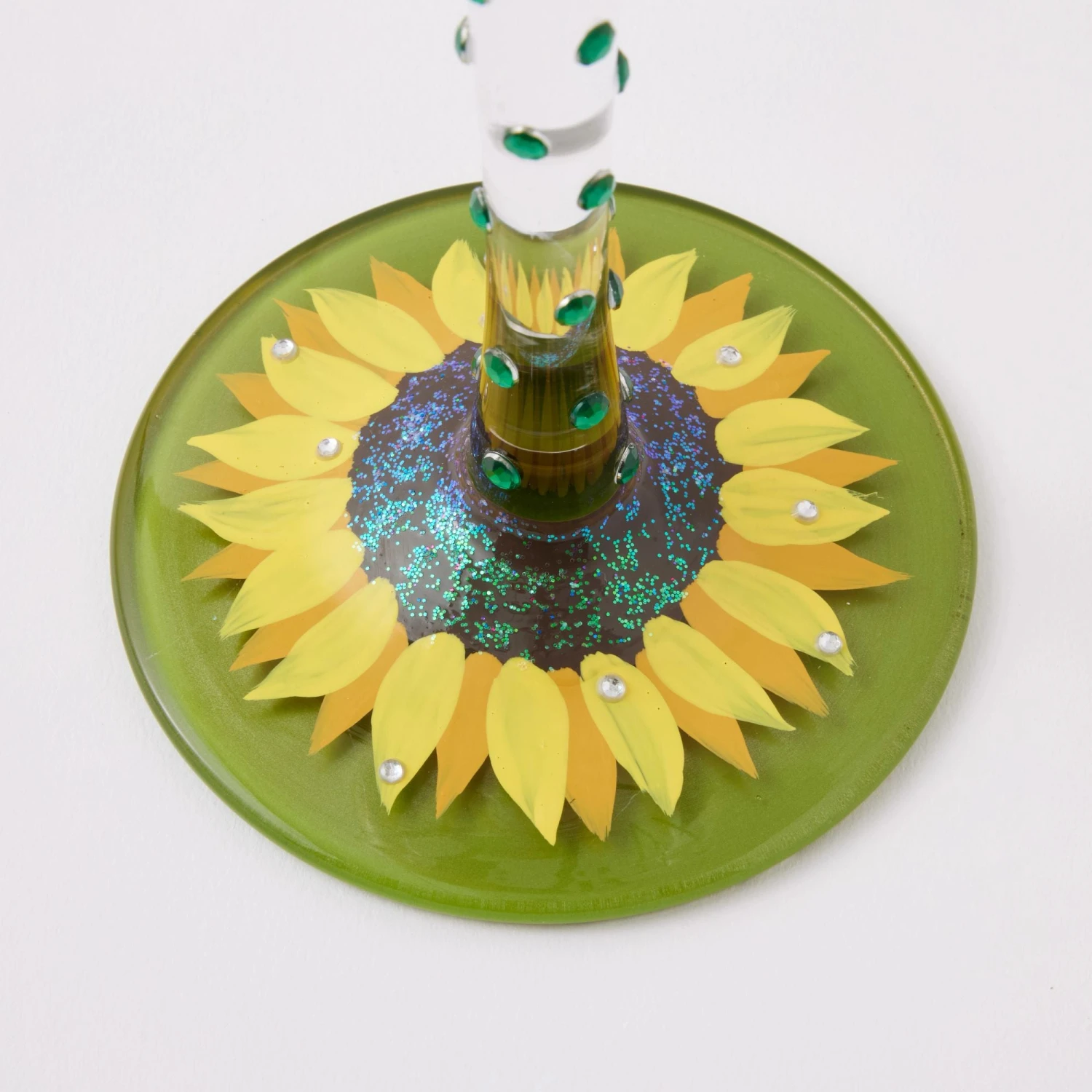 Brighten your day with this stunning Lolita wine glass, patterned with cheerful sunflowers and shimmering glitter paint. Bejeweled details add a touch of sparkle, making every sip feel as radiant as a sunflower in full bloom.