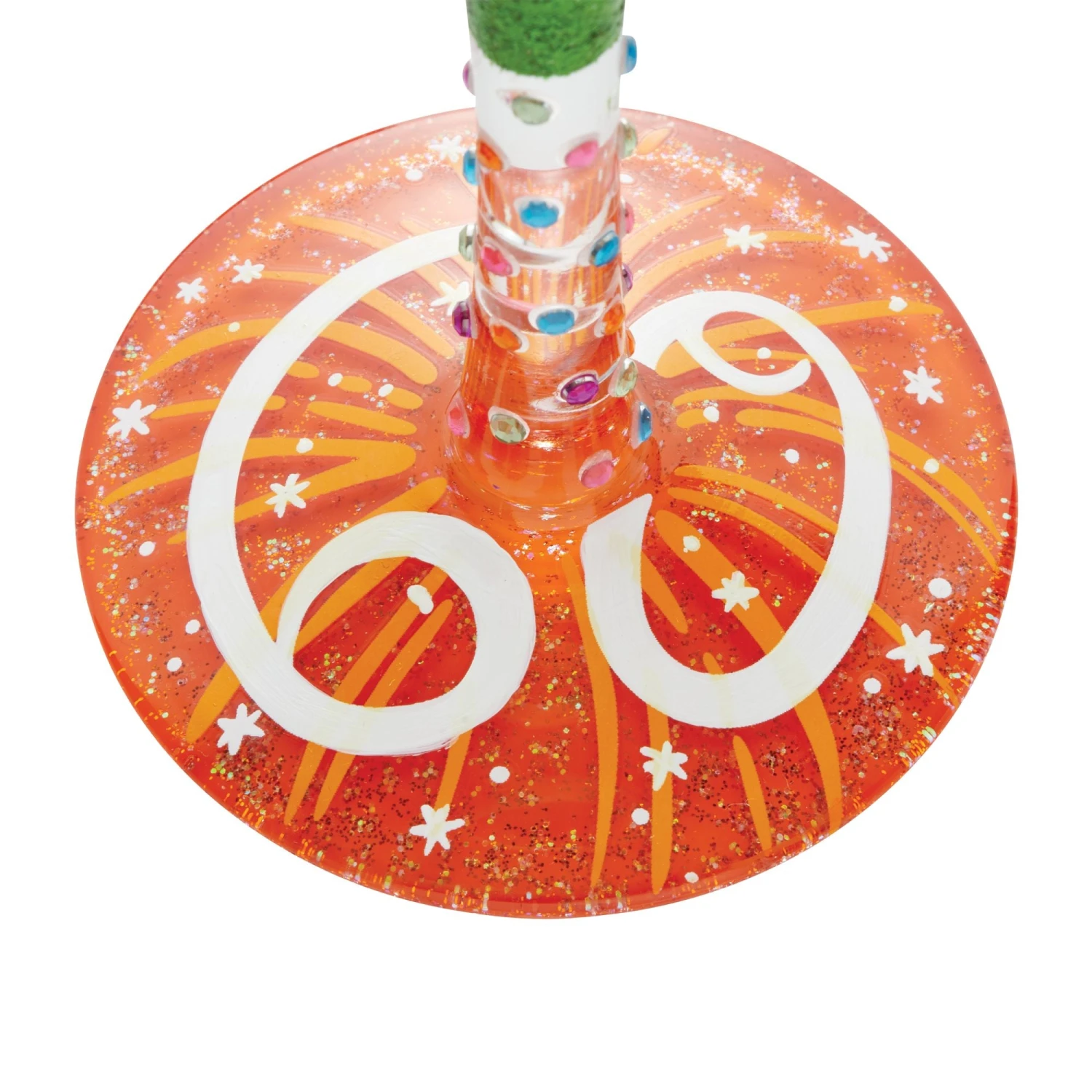 Celebrate turning 60 with a spectacle of color and charm. Decorated with shimmer and sparkling fireworks, this 15 oz capacity wine glass bursts with birthday blessings and youthful radiance. Capture the impressive milestone with this stylish sipper!